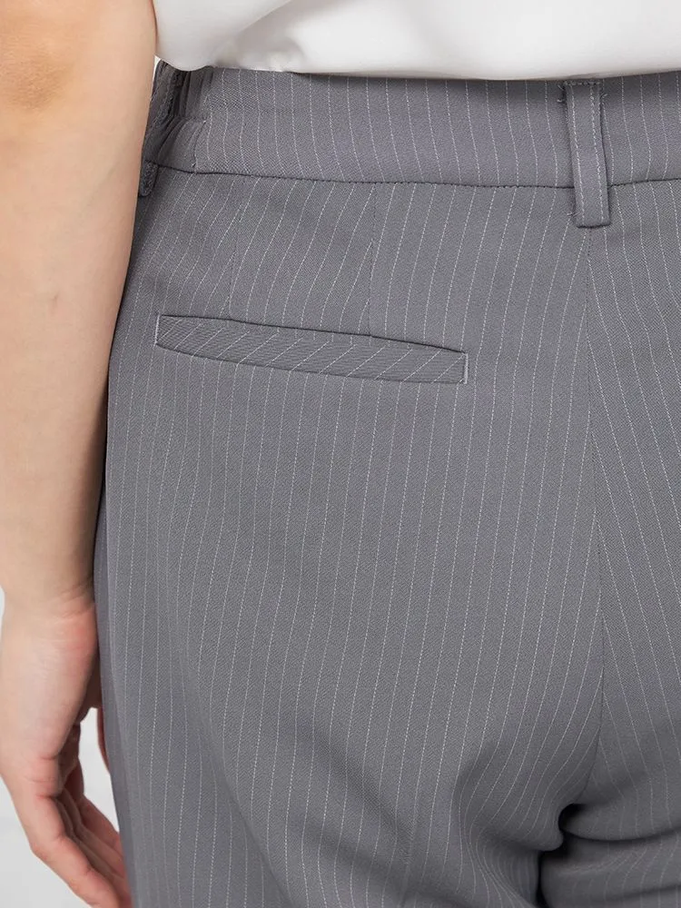 クールな印象を引き立てる、ピンストライプ柄のパンツスーツ。