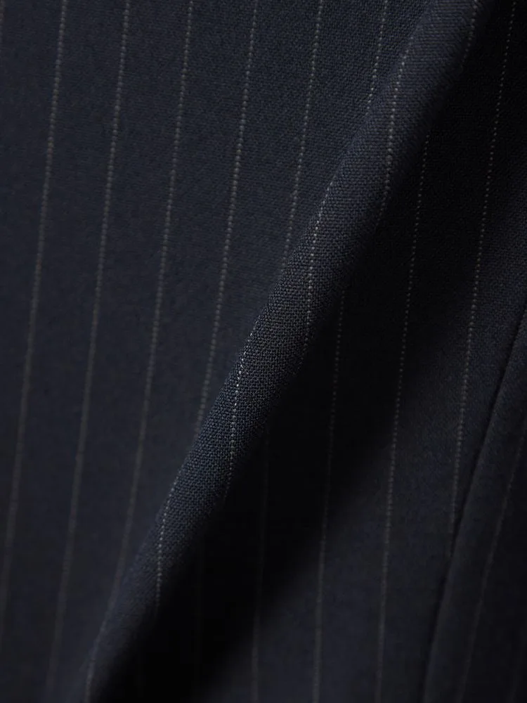 すっきりとした美脚を叶えるピンストライプ柄のテーパードパンツ。裾に向かって自然と細くなるシルエットにセンタープレスを施しています。
