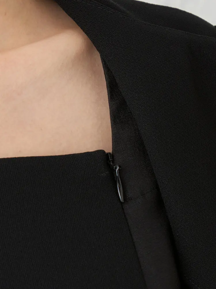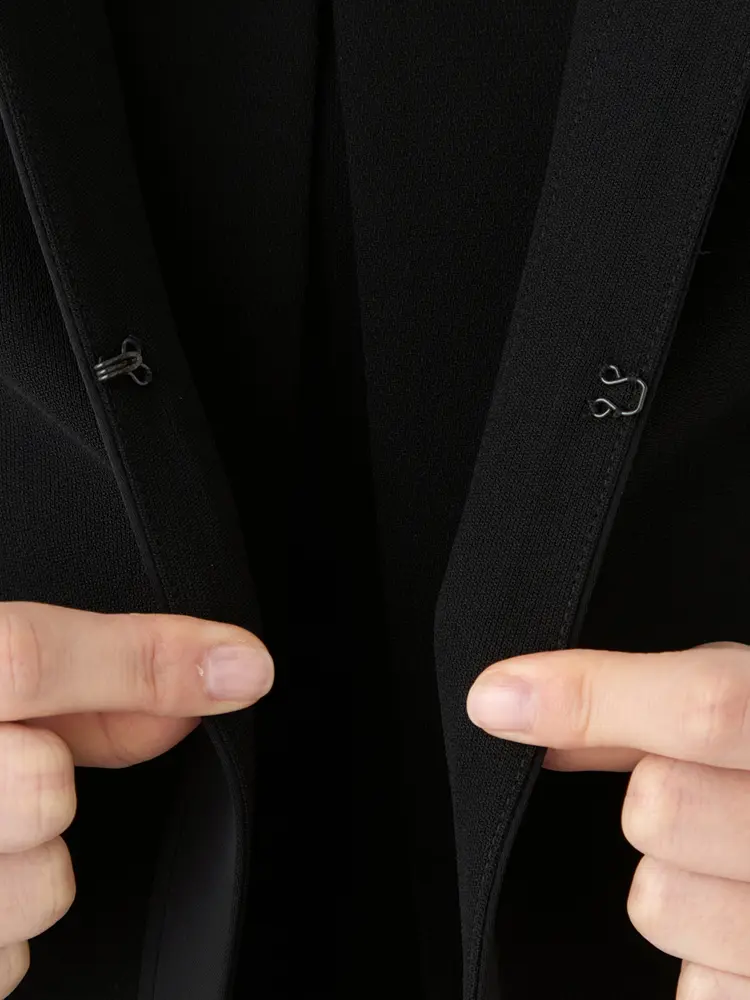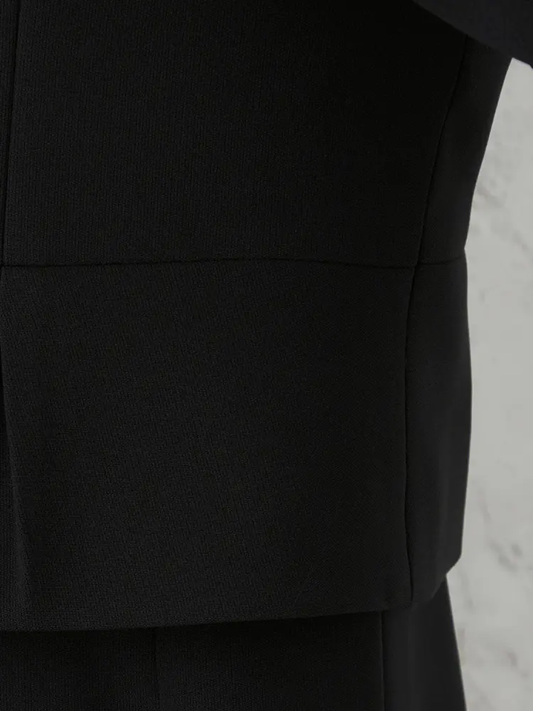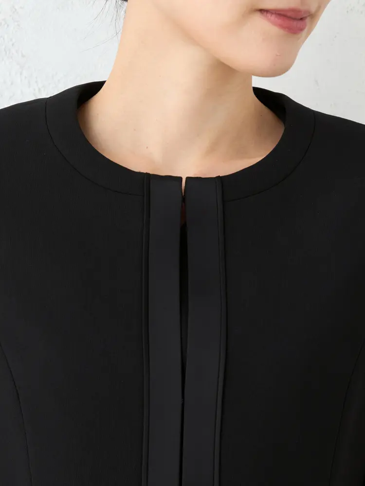 ジャケットはさりげないペプラム仕立てに、縦のサテン切り替えがスッキリとした印象を演出。