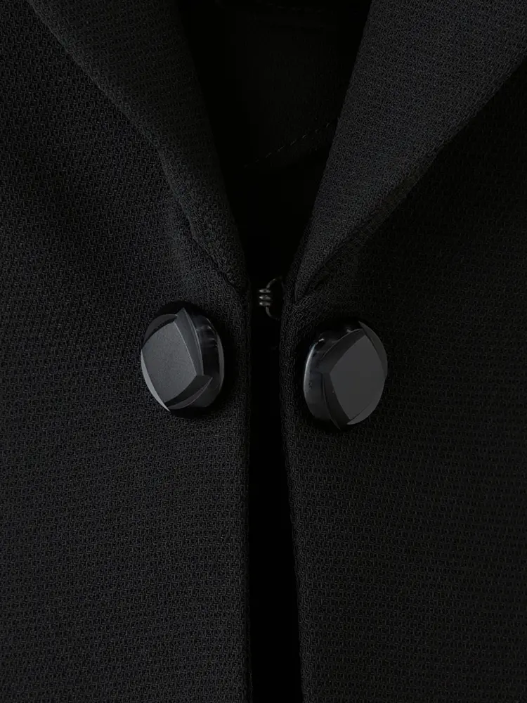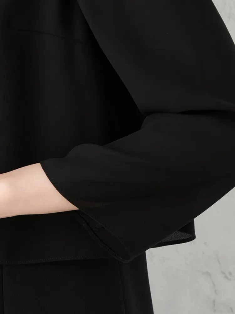 ジャケットを脱いでもブラウスを重ねたような華やかなデザインが魅力です。