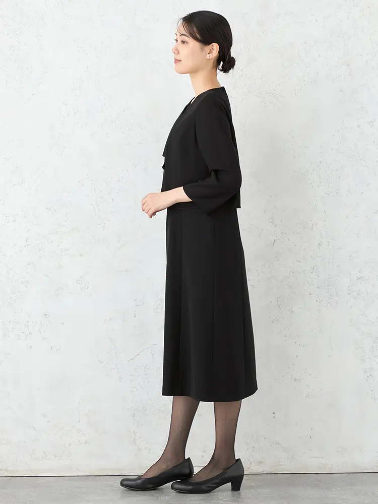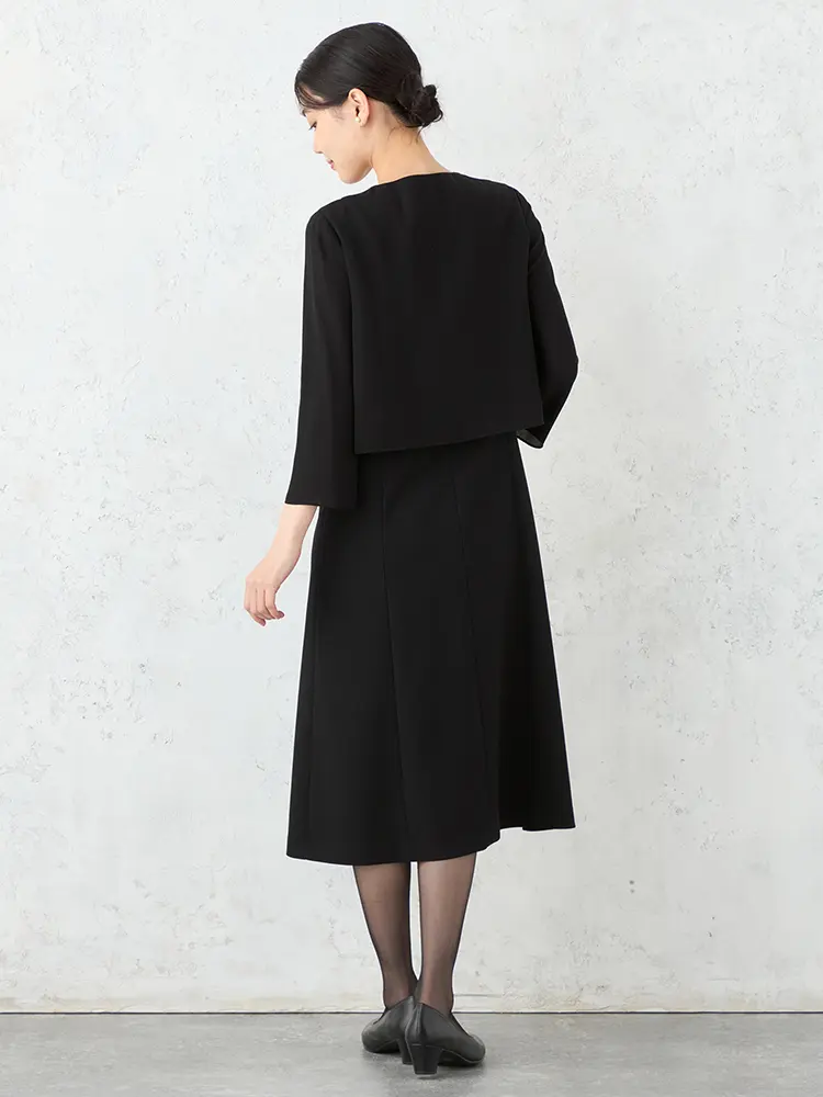 サテン衿を重ねたスッキリとしたテーラージャケットに、リボン調にデザインされた上品なワンピースのセット。