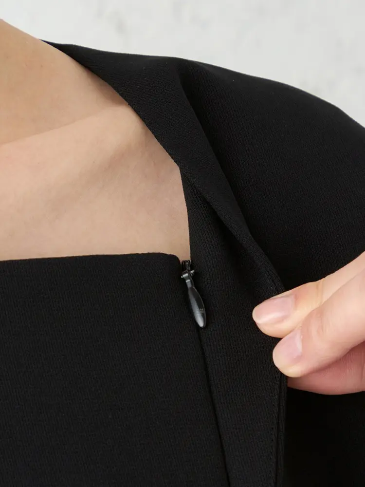 前ファスナー仕様で着脱しやすく、スタイルを美しく見せるダーツデザインや便利なポケットも備えました。