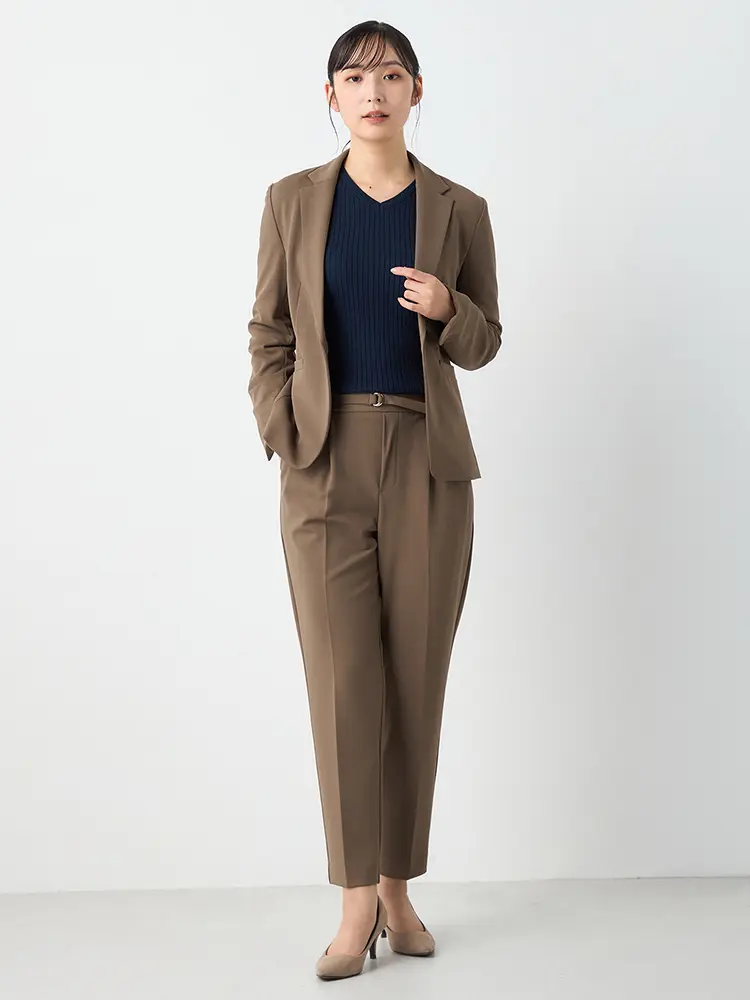 1つボタンのテーラードジャケットに、スマートなテーパードパンツを組み合わせました。