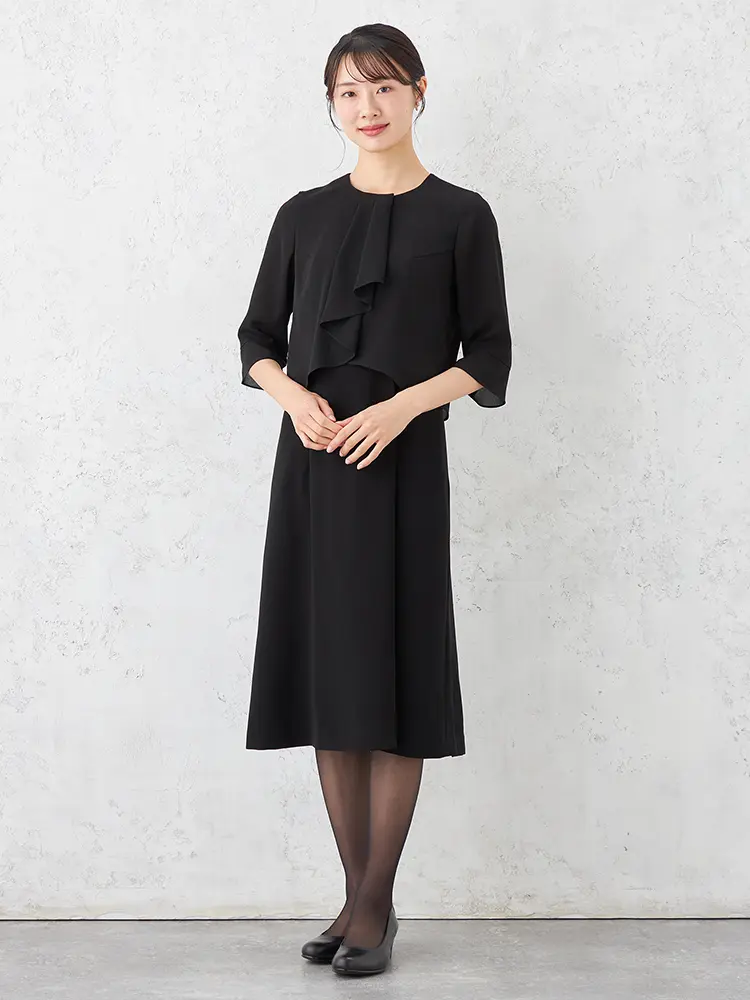 フロントのラッフルフリルが華やいだ表情を演出するワンピース。