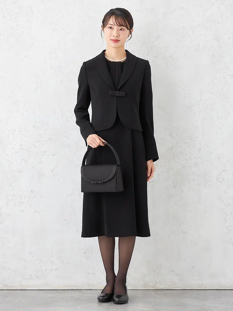 ショールカラーのジャケットつきで、オールシーズンの着こなしに対応します。