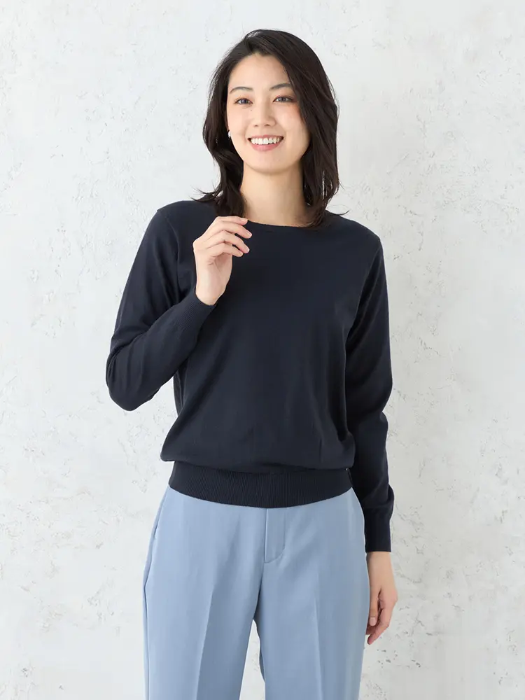 汎用性に優れたシンプルなクルーネックニットです。