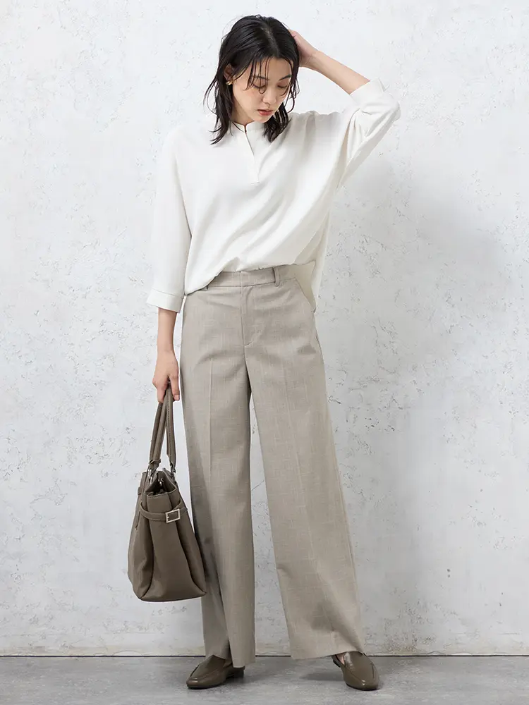 顔まわりをすっきり見せるシャープなスキッパーネックブラウス。
