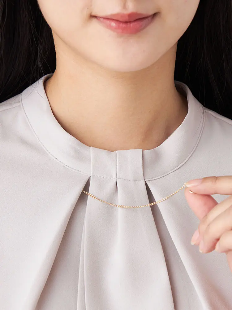 首元のタックとメタリックチェーンがアクセント。