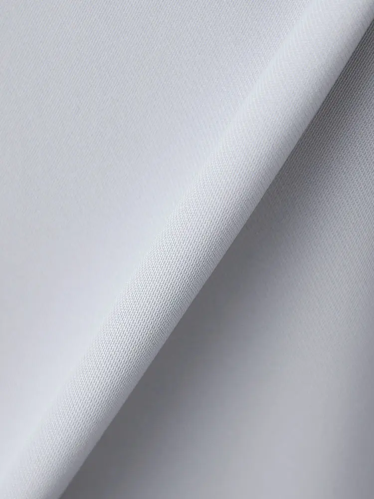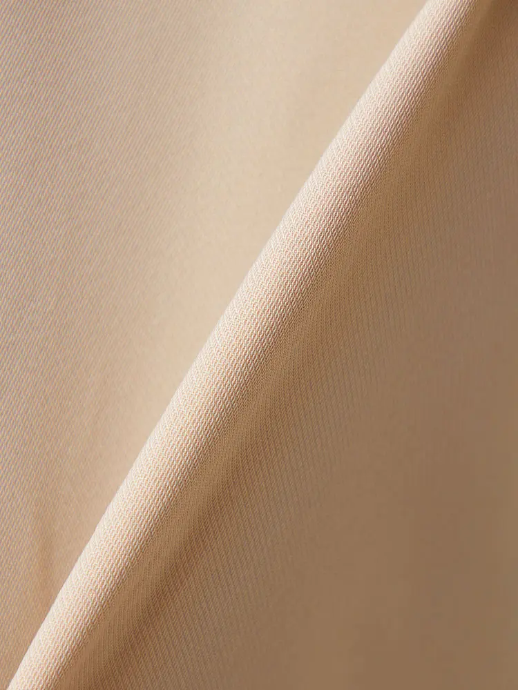 柔らかく高級感のあるツイル素材を使用し、前身頃の縦タックと重ね生地のデザインがスマートなスタイルアップを叶えます。