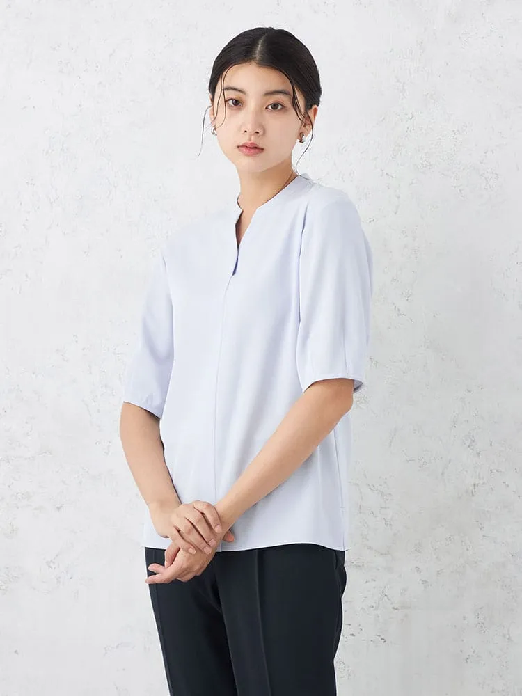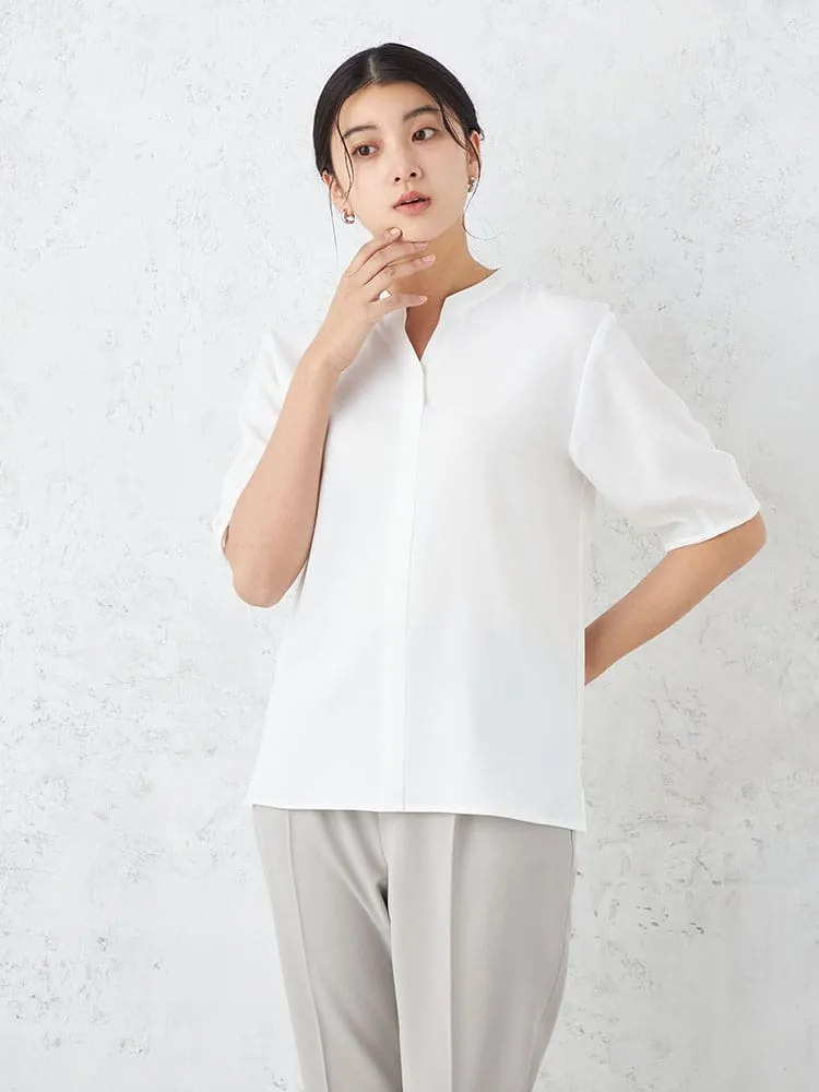 スラッシュ開きのスタンドカラーブラウスです。