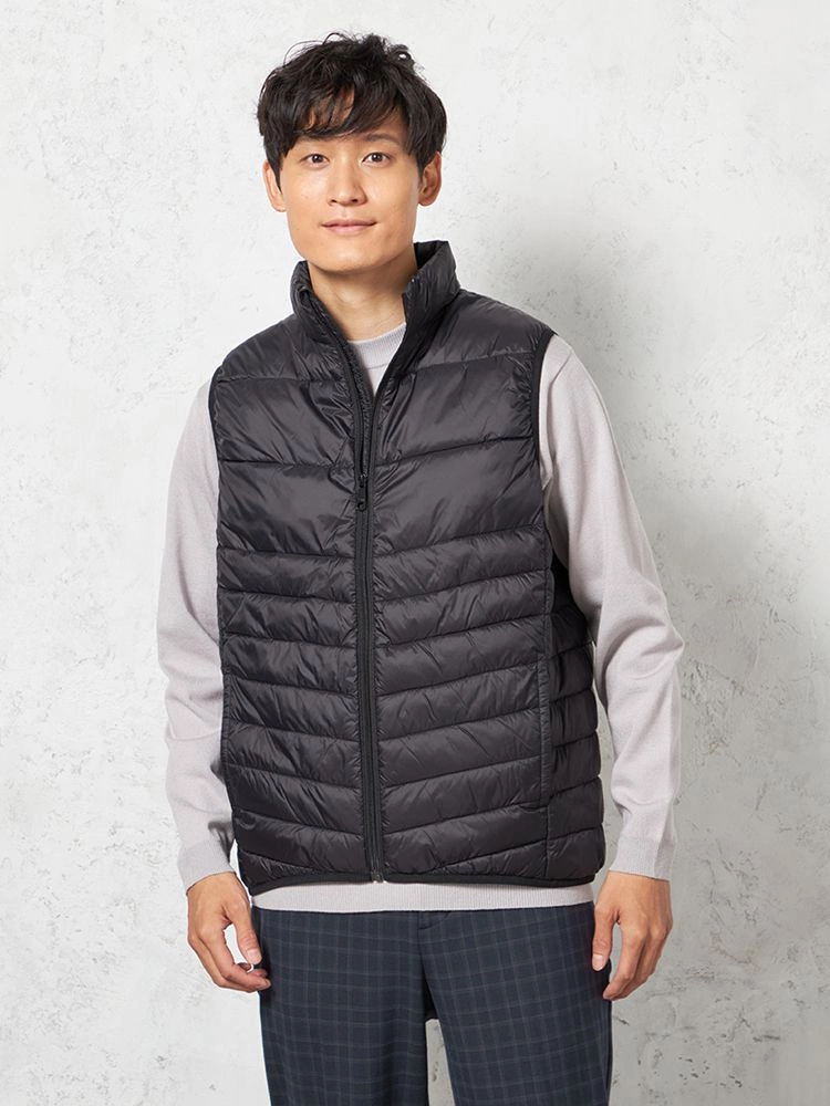 首まわりを包み込むスタンドネックタイプの中綿ベスト。