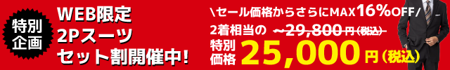 ▽WEB限定2Pスーツ限定まとめ買い企画!2着で25,000円セール実施中!▽