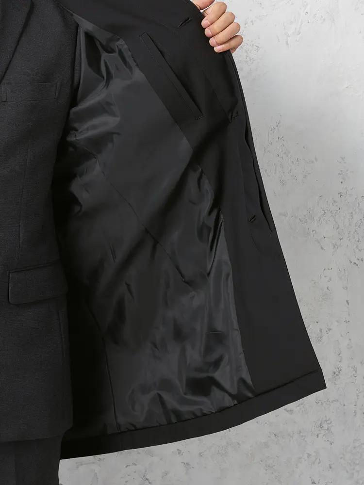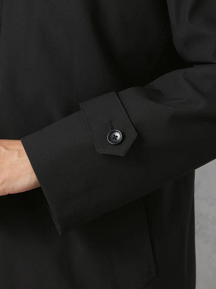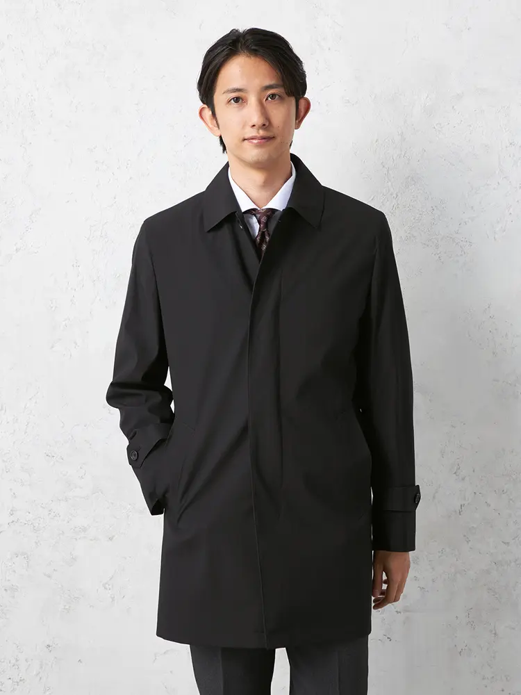 センターベントで動きやすく、比翼仕立てのデザインがスマートな着こなしを演出する、機能美に優れた一着です。