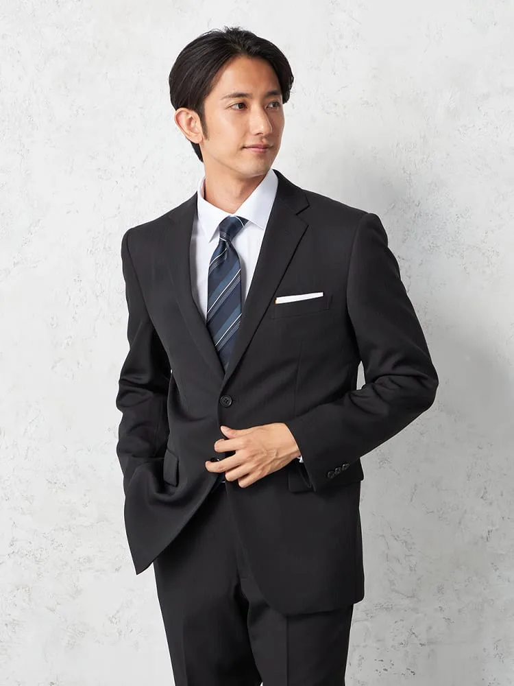 汎用性の高いブラックカラーをベースにしたツーピーススーツ。