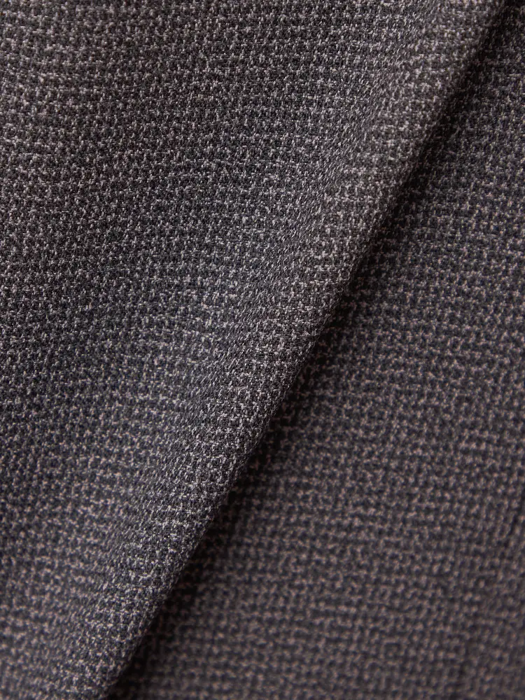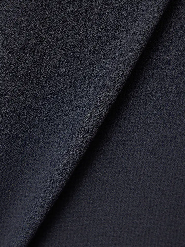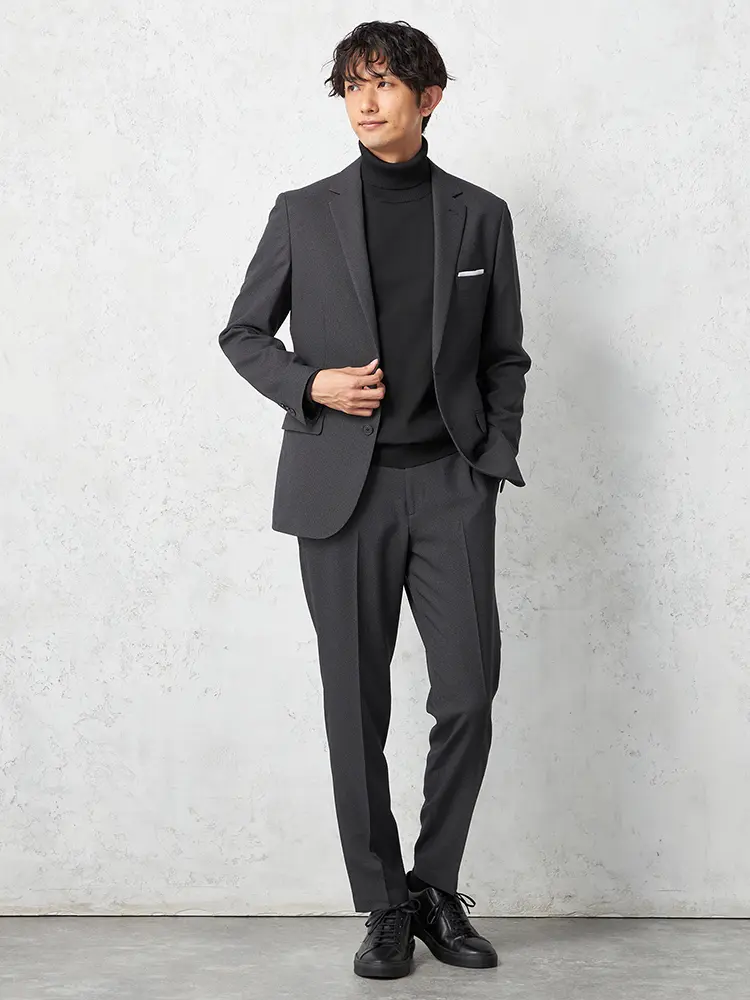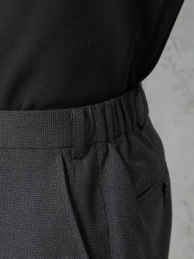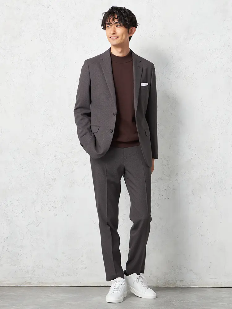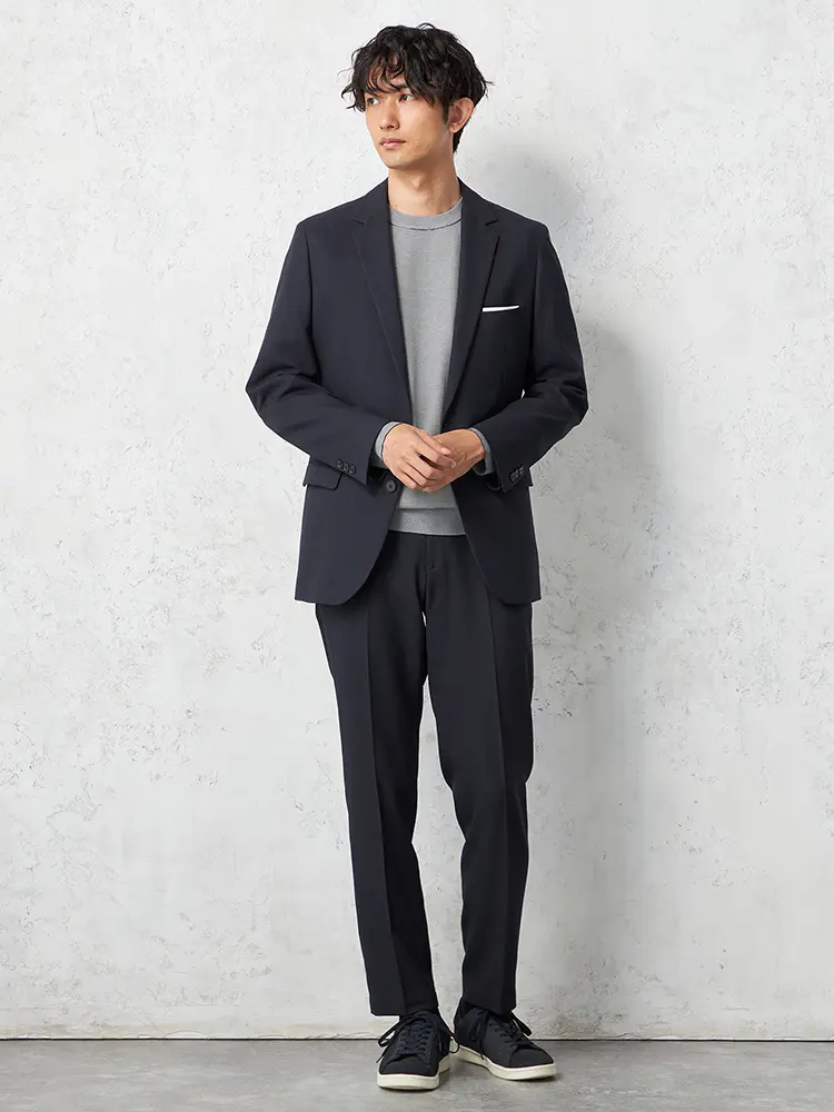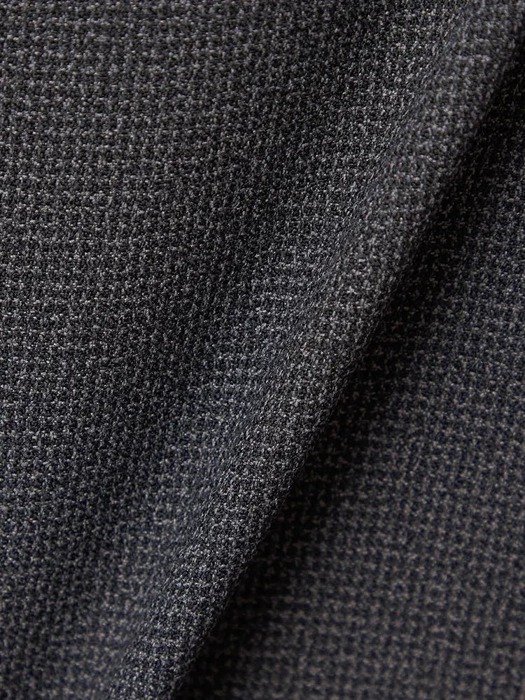 丈夫でしわになりにくいポリエスエル100%素材使用しながら、ウールの様な質感とストレッチの効いた快適な着心地を両立。