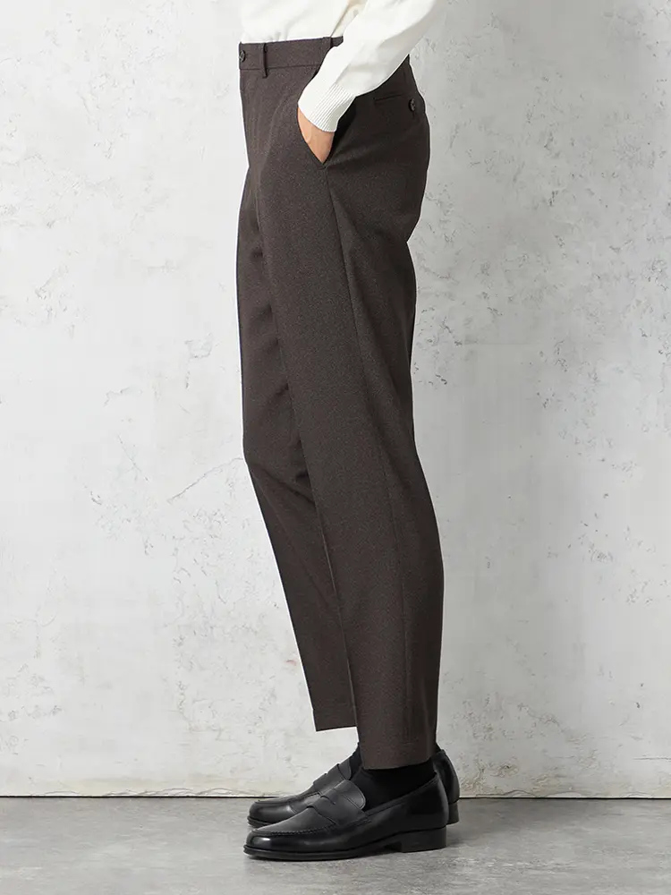 ノータックですっきりと仕上げた細身のテーパードシルエットの単品使いもできる万能パンツ。