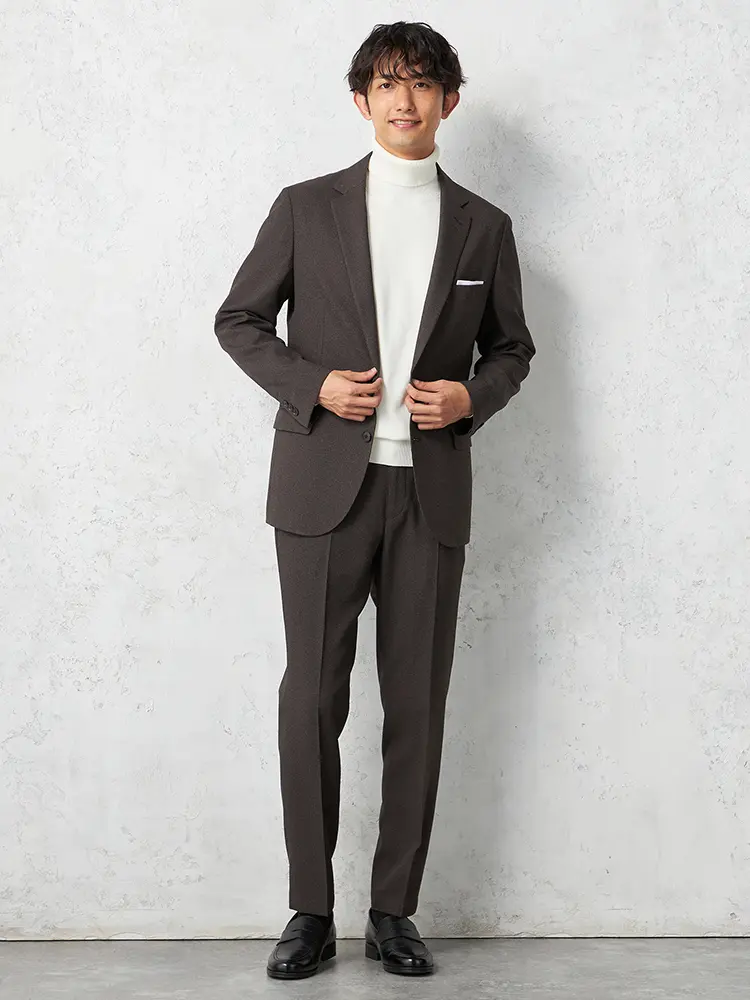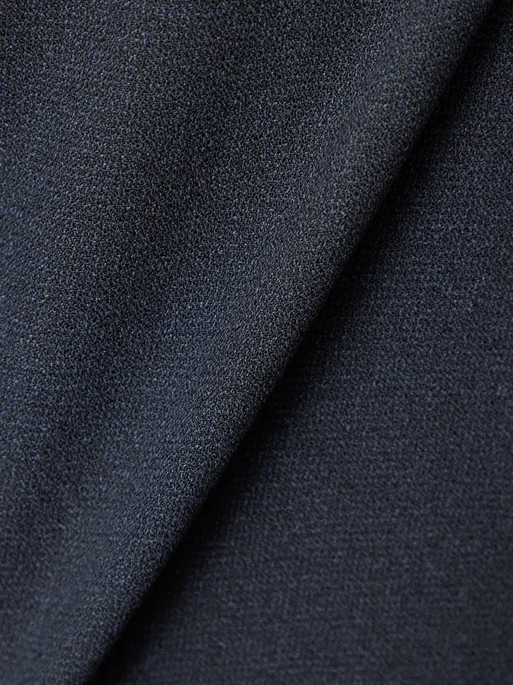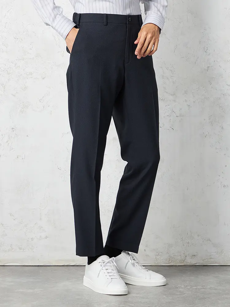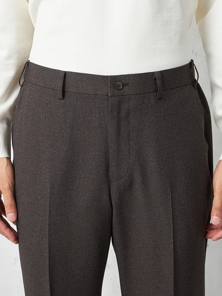 ストレッチ性を持ち、適度な厚さがありながら通気性もよい、表面感のあるウールライクポリエステル生地を使用し動きやすく快適な穿き心地です。