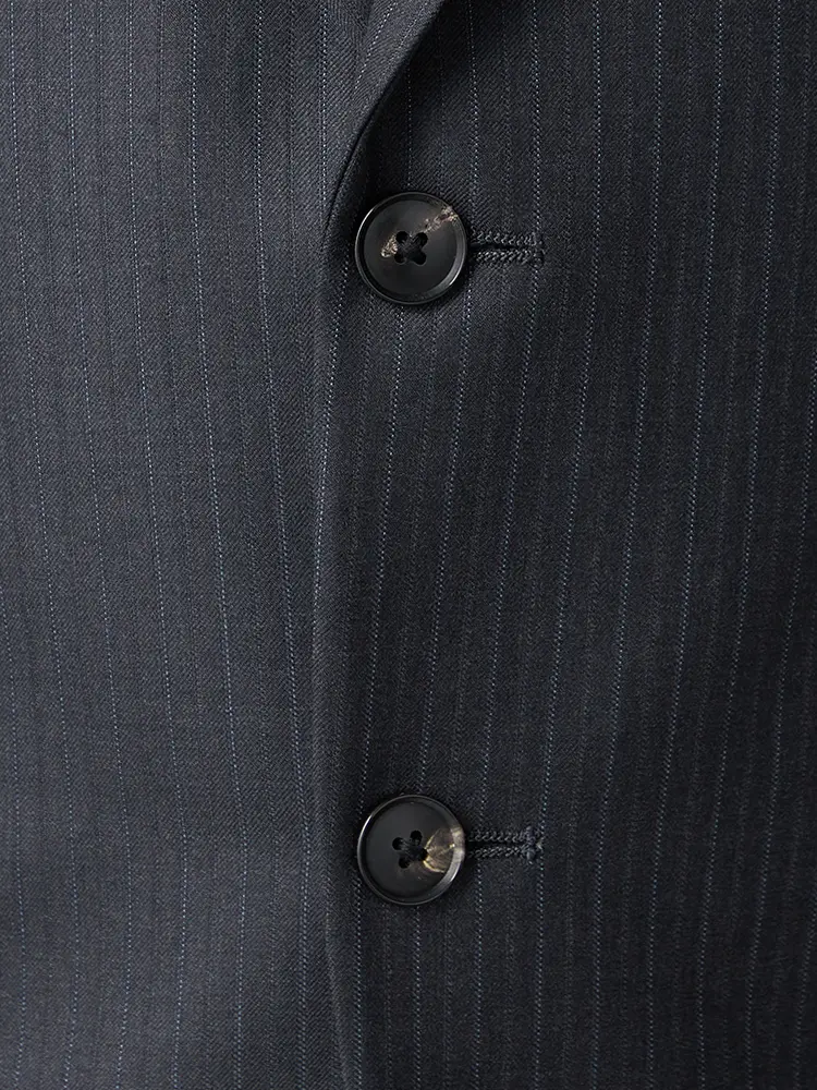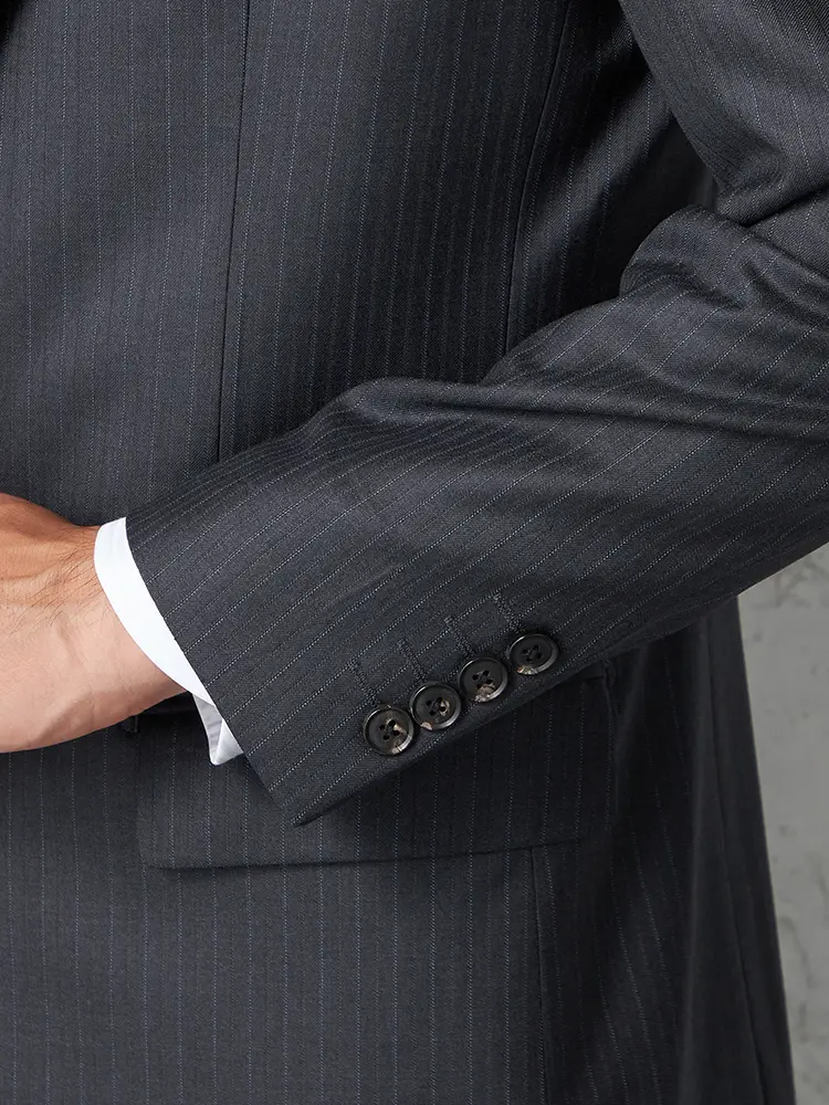 毛芯仕上げのラペルや本水牛のボタンなど、ディテールにもこだわりが感じられます。