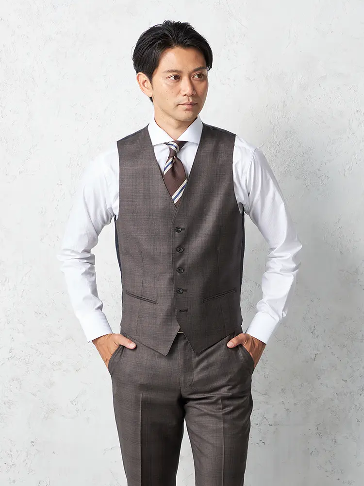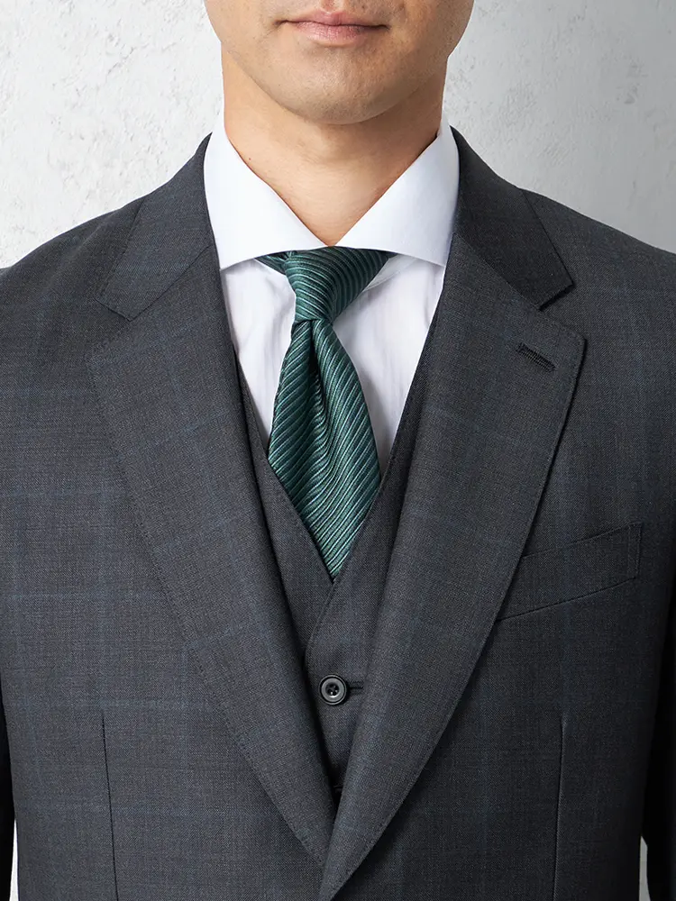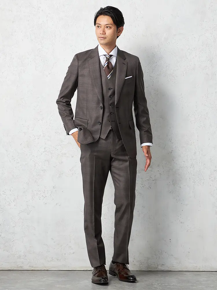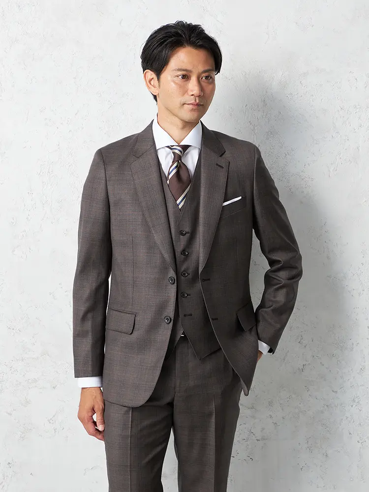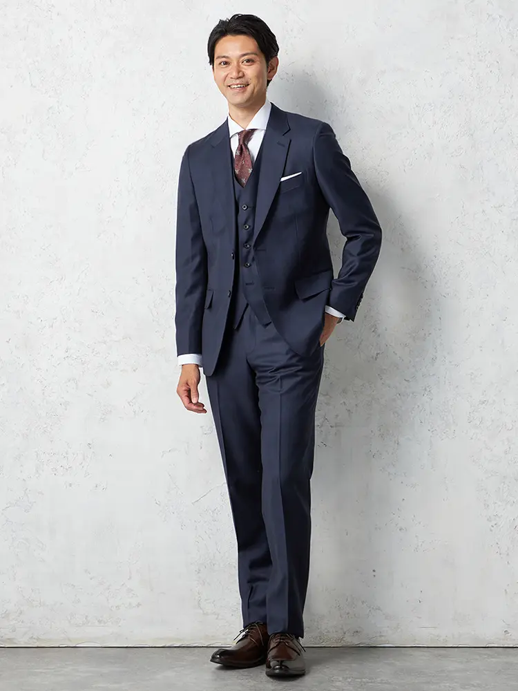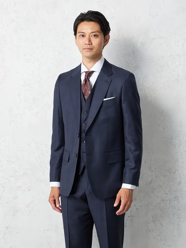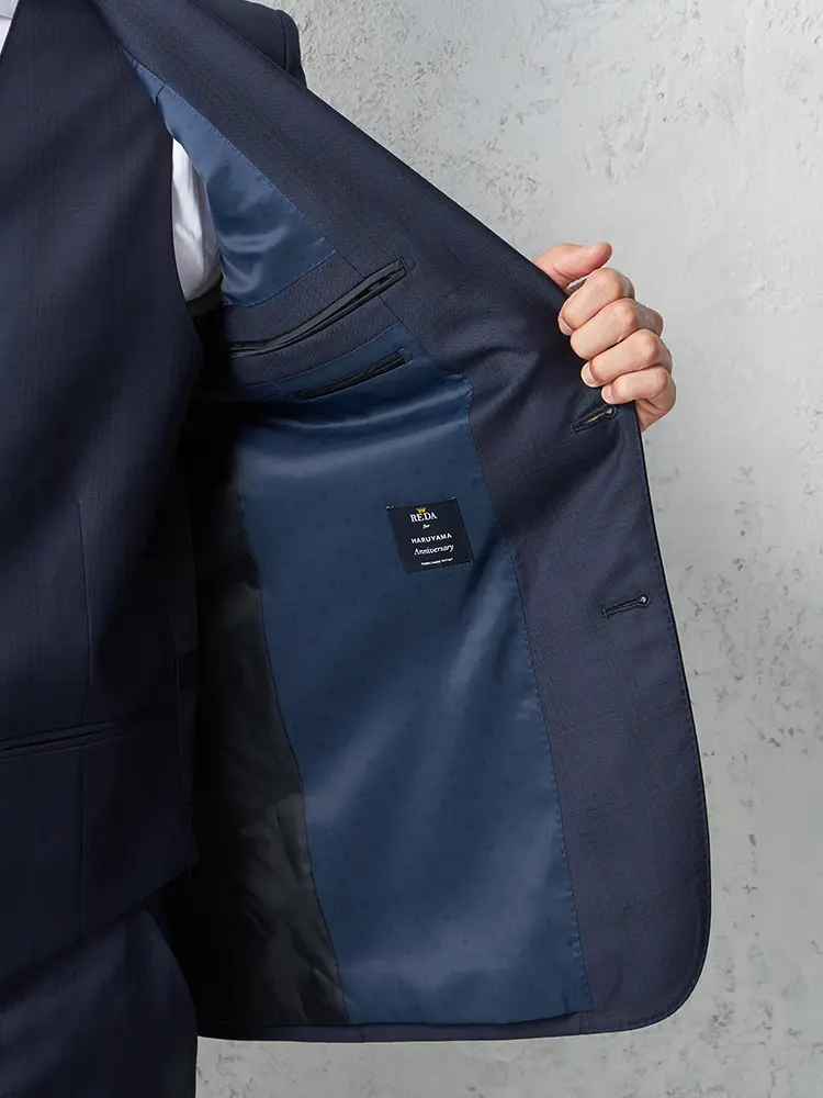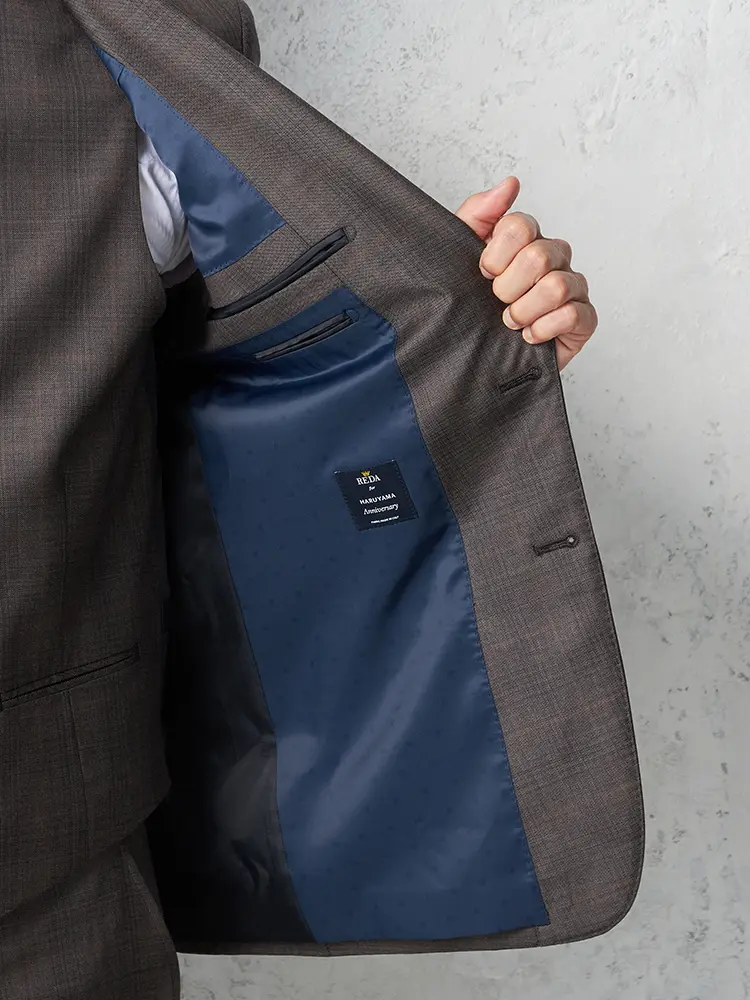 背抜き仕様のスリーピーススーツには、イタリアの老舗生地メーカーREDAの生地を使用しています。