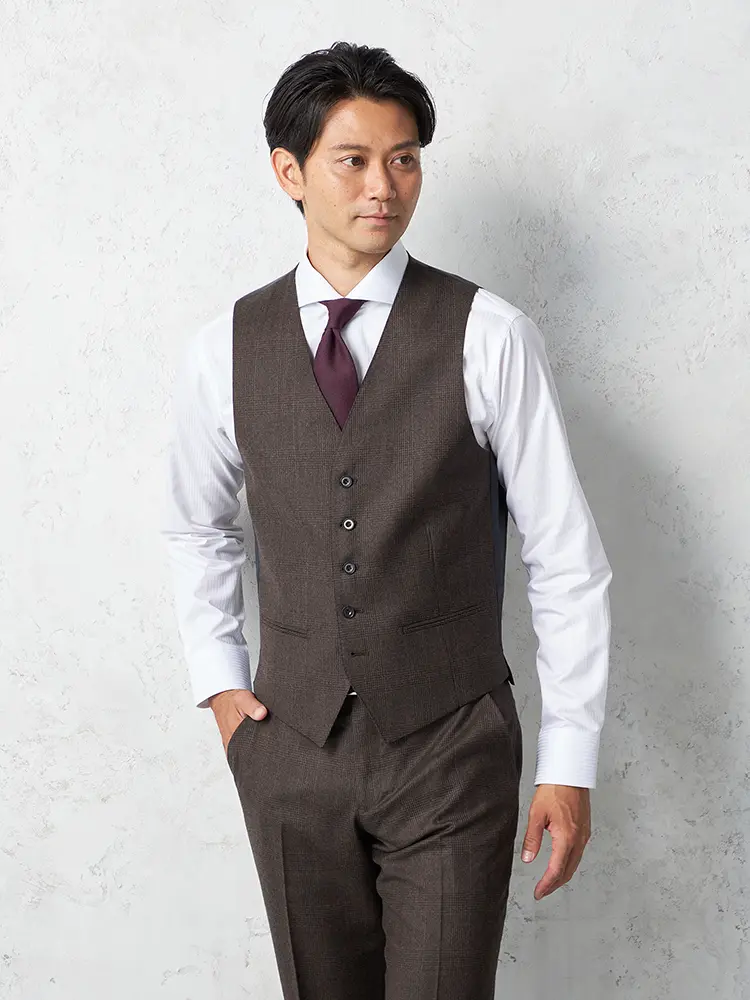 グレンチェック柄のセンターベントのノータックスリーピーススーツ。