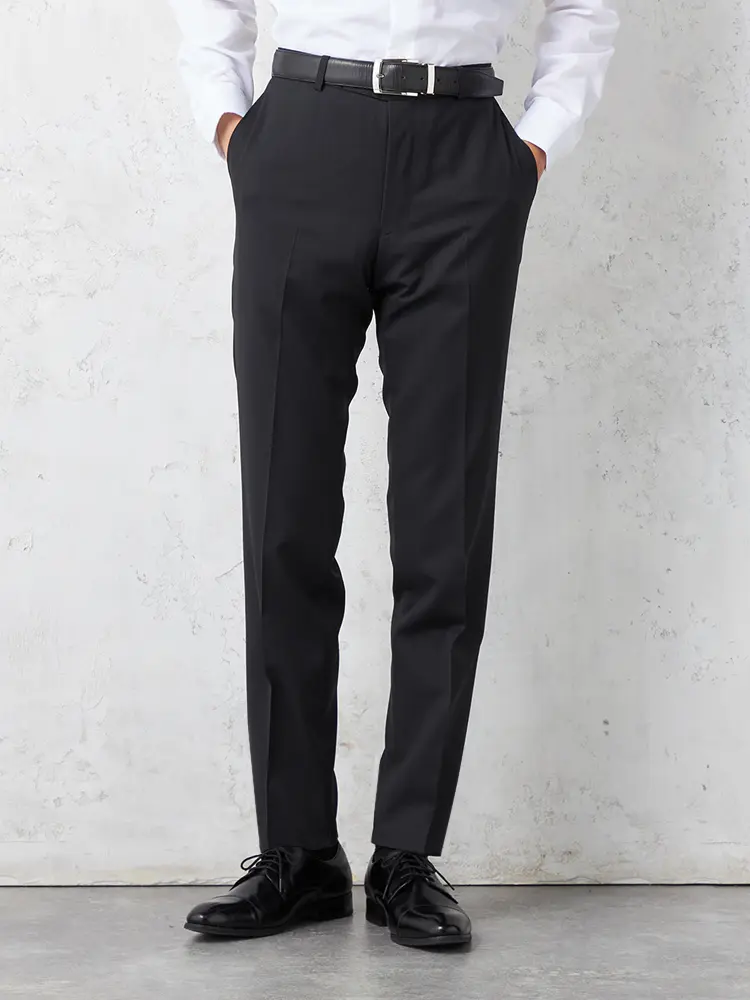 背抜き・サイドベンツ仕様のジャケットに、腰回りもすっきり見えるノータックパンツを合わせました。