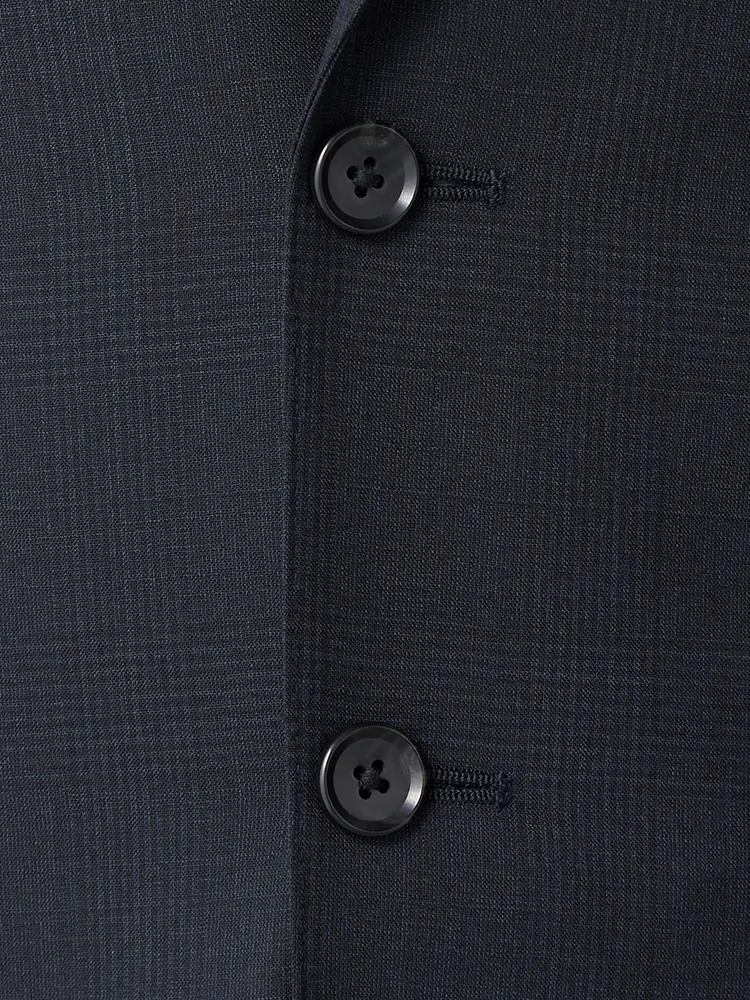 ネイビー基調のトラディショナルなチェック柄が目を引く、上品な一着。