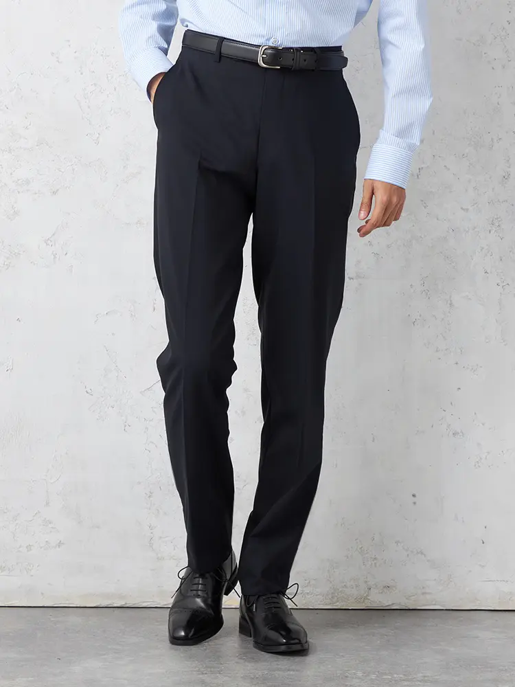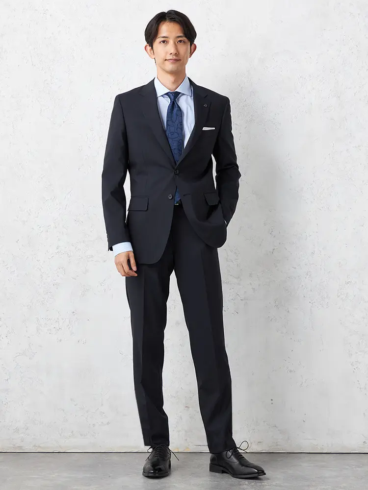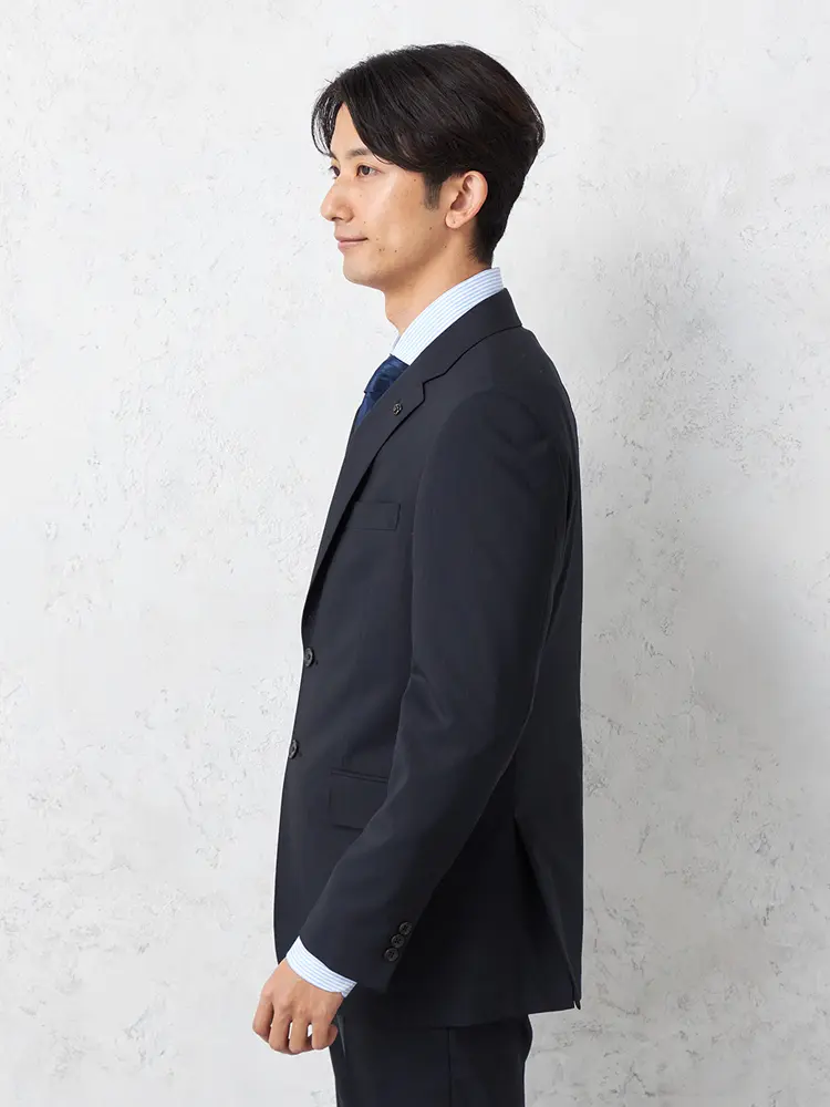 ジャケットは背抜き仕立てとサイドベンツで動きやすく、パンツはノータックで美脚見えを叶えます。