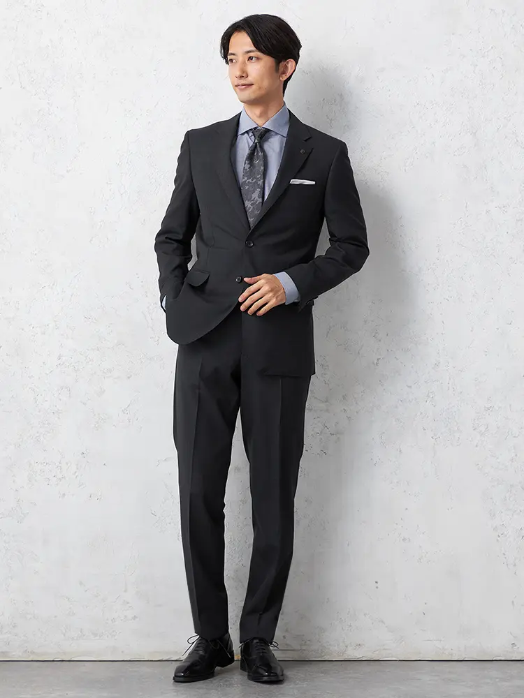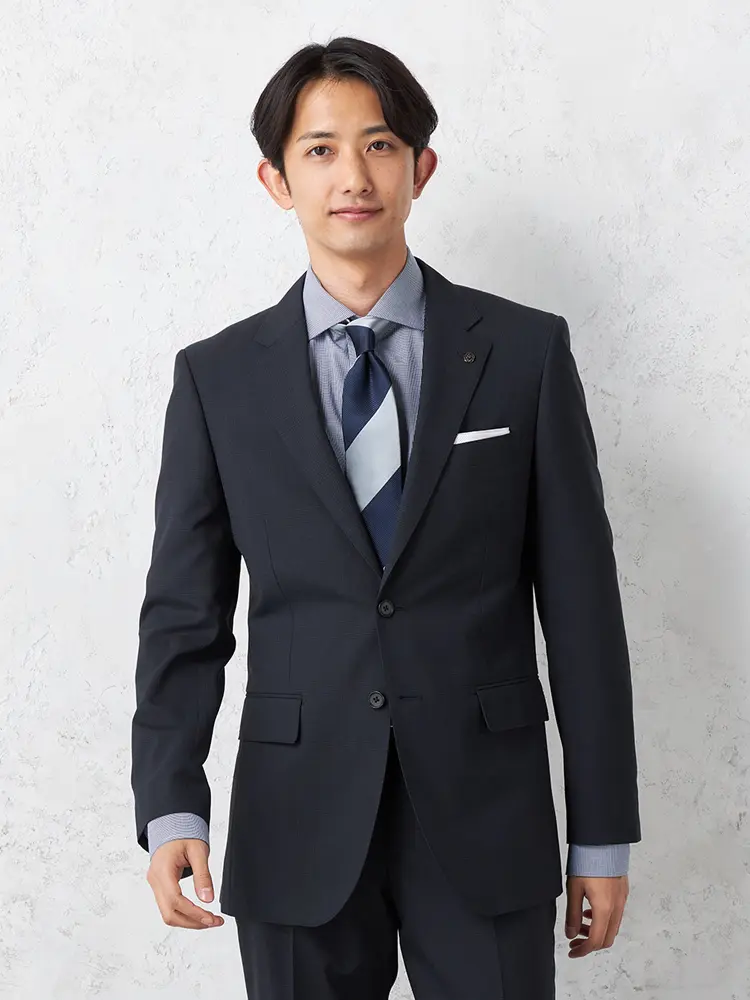 シックな2つボタンの無地スーツ。