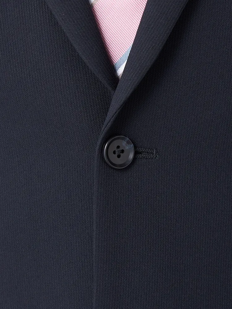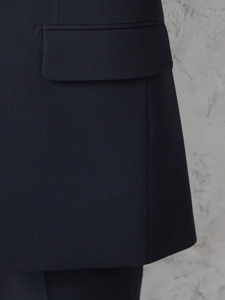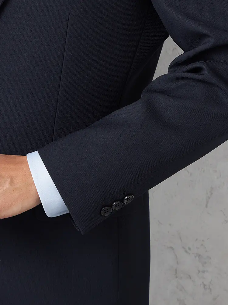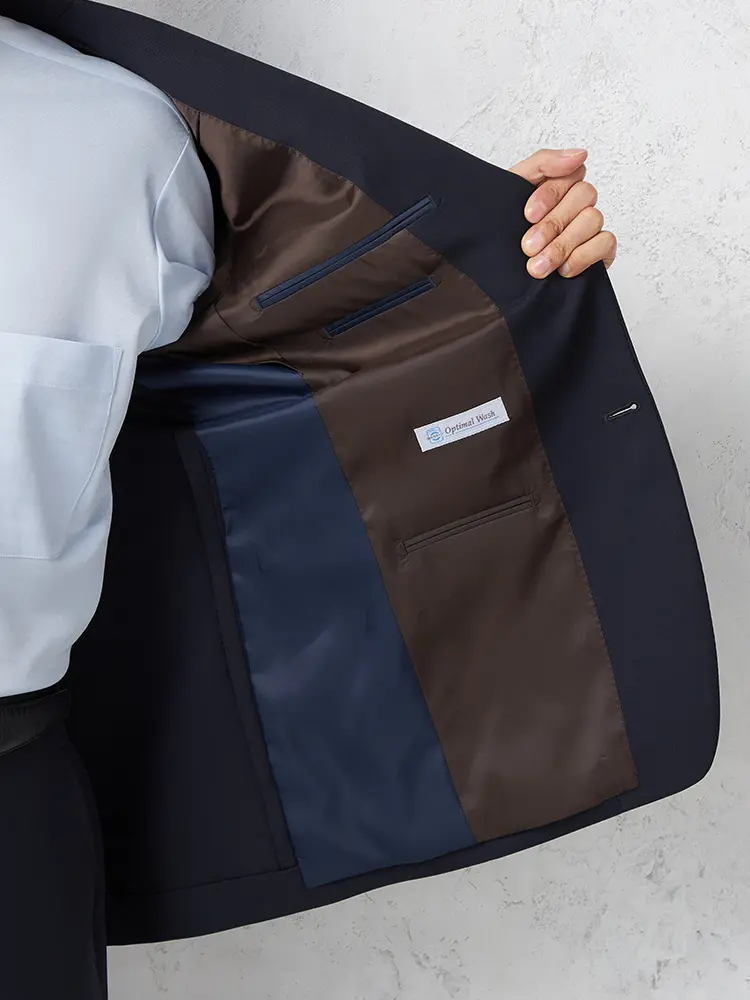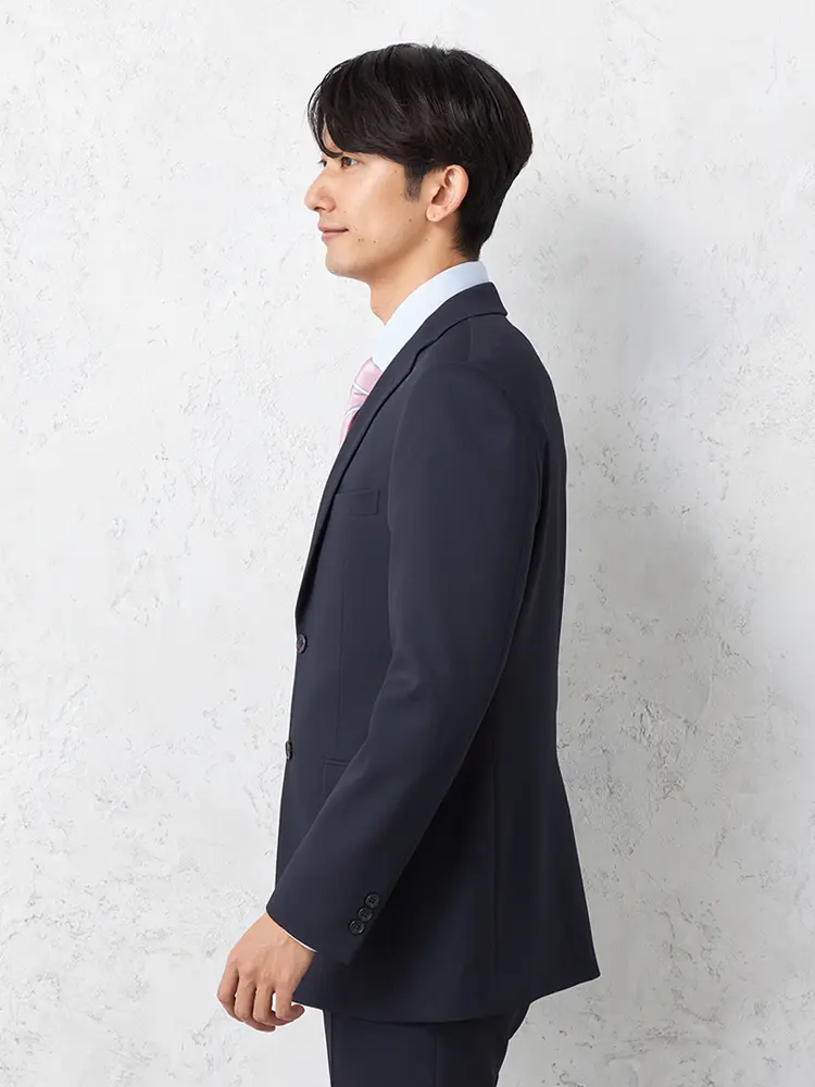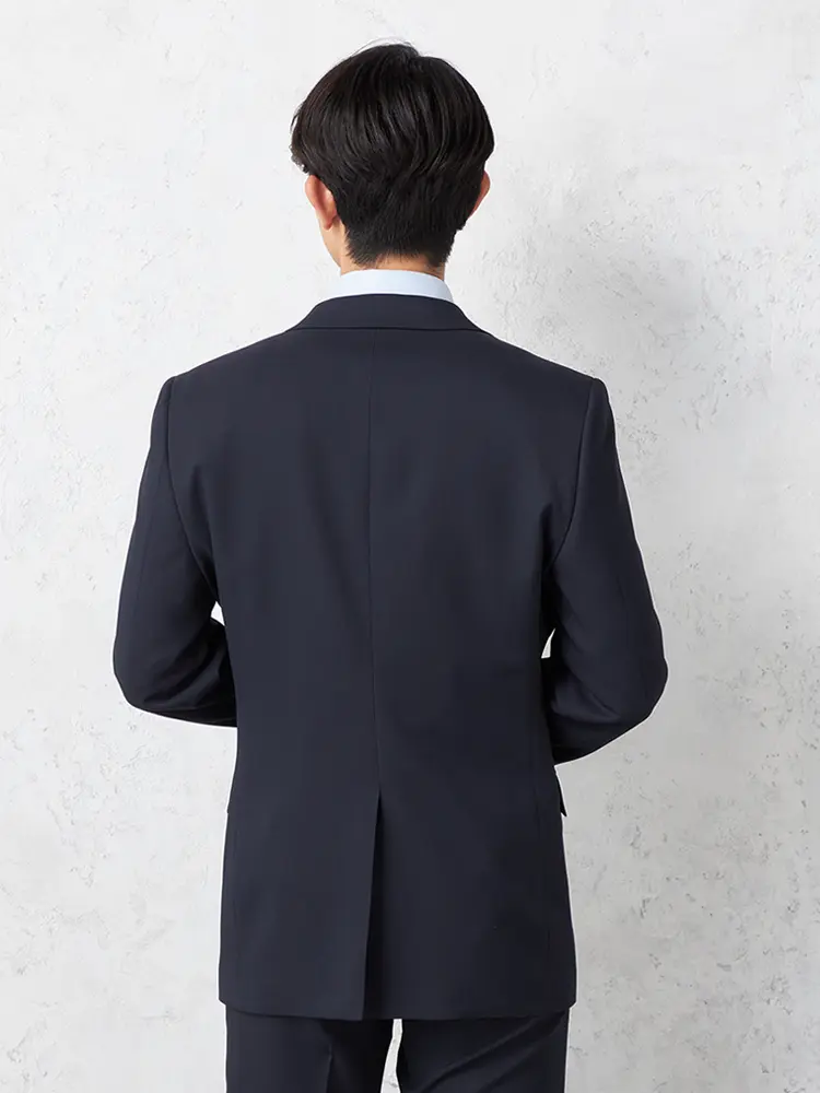ポリエステル100%の丈夫でシワに強い素材を使用した、上下ウォッシャブル仕様の2つボタンスーツ。