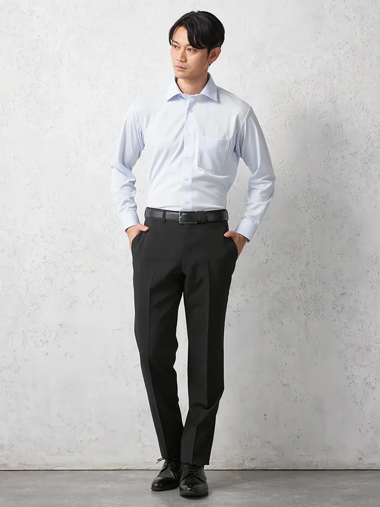 スリムなテーパードシルエットとセンタープレスが、すらりとした縦長ラインを強調します。