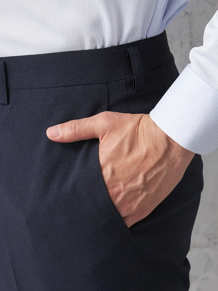 【スマビズパンツ】ノータックスラックスパンツ織柄無地ストレッチウォッシャブル春夏