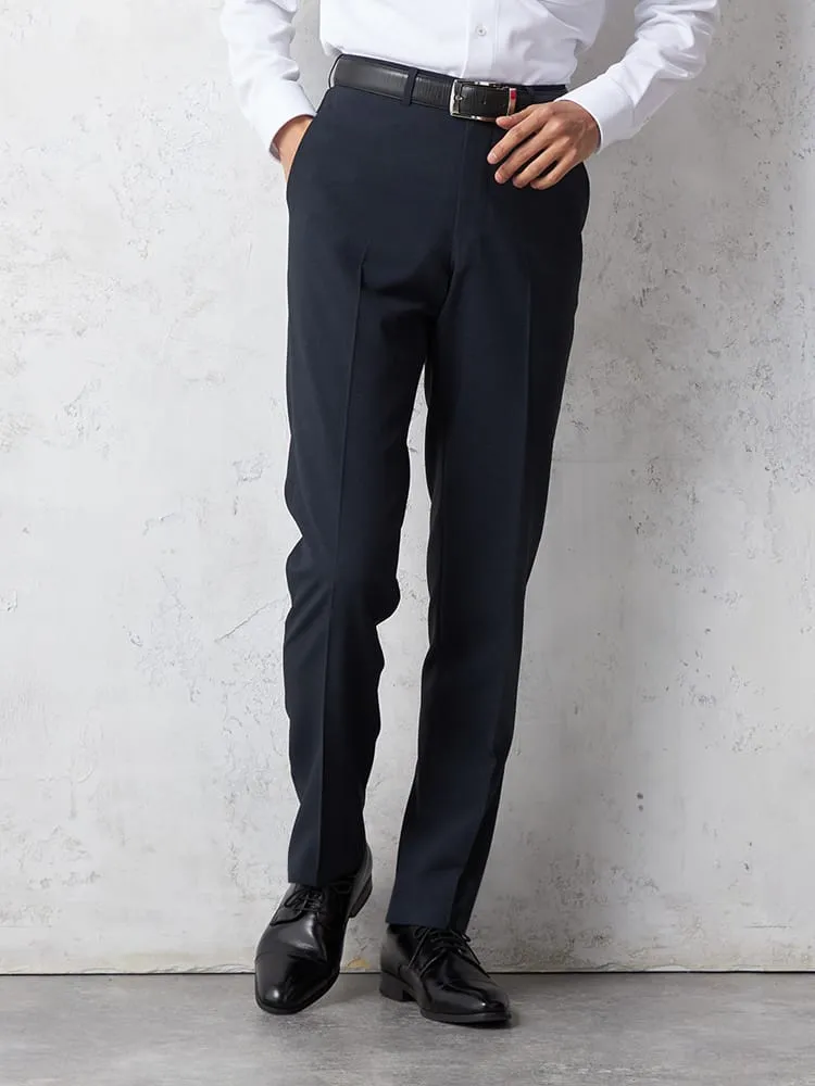 パンツの腰回りに生地の折り込みがなく、スッキリとしたシルエットを実現します。シンプルで洗練された印象を与え、すっきりとした着こなしが可能です。