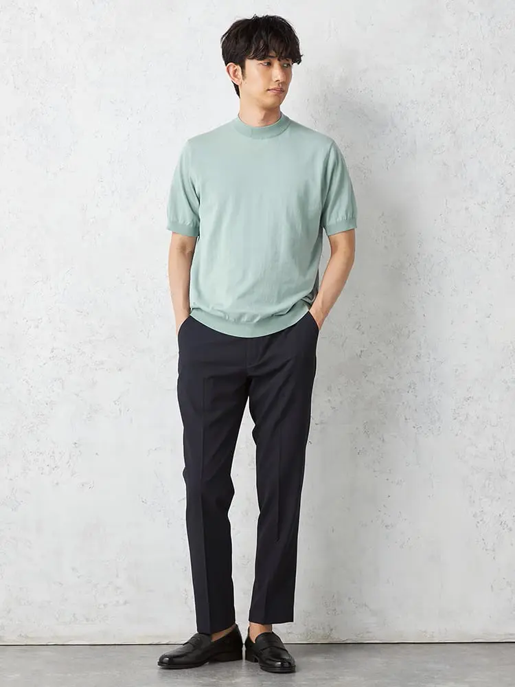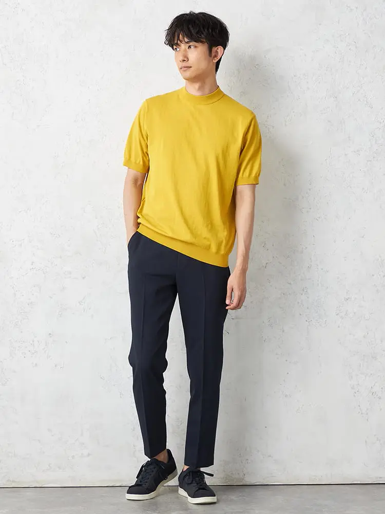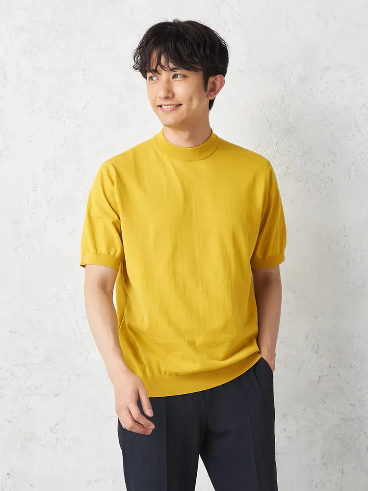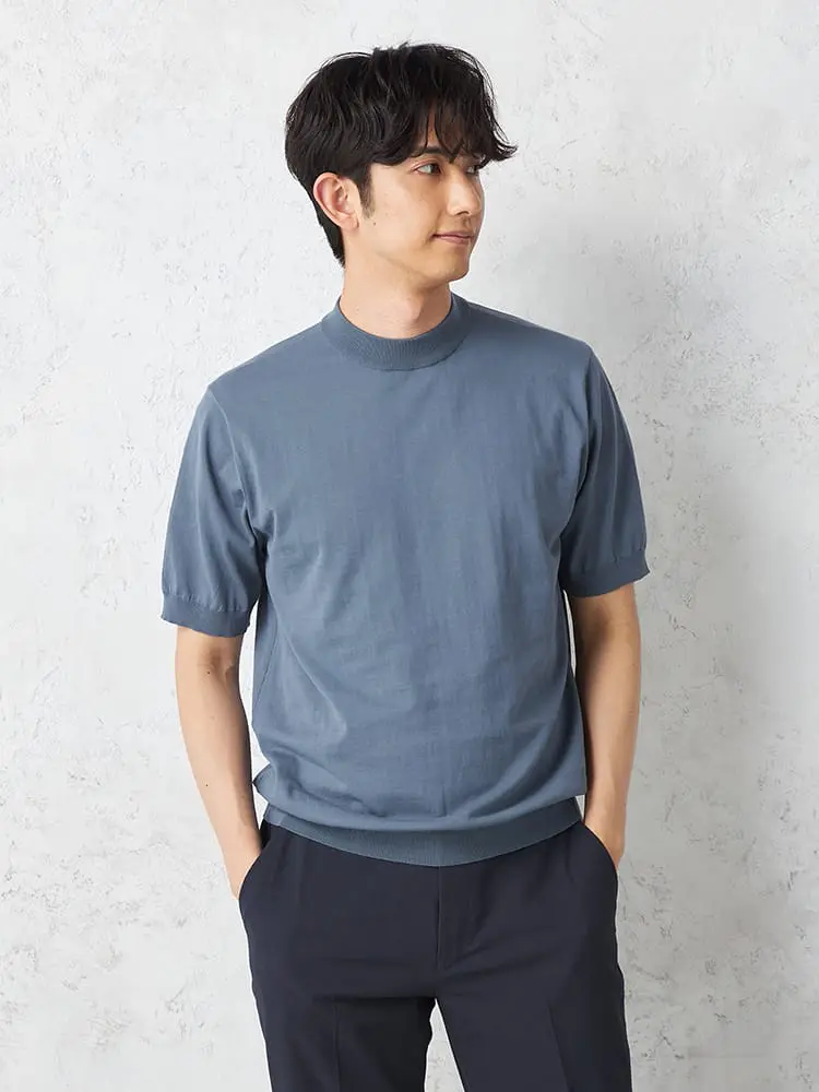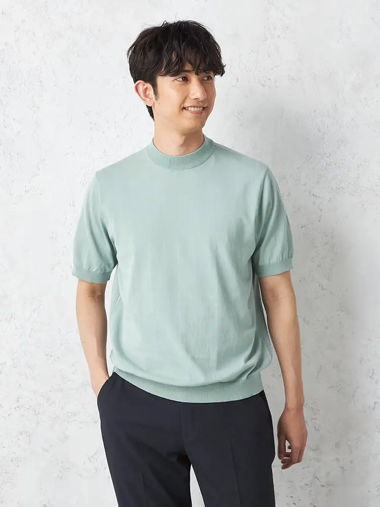 【綿100%】半袖モックネックニットTシャツカジュアルインナー無地リッケンバッカー春夏