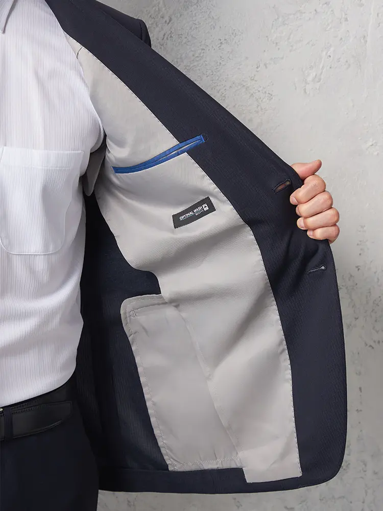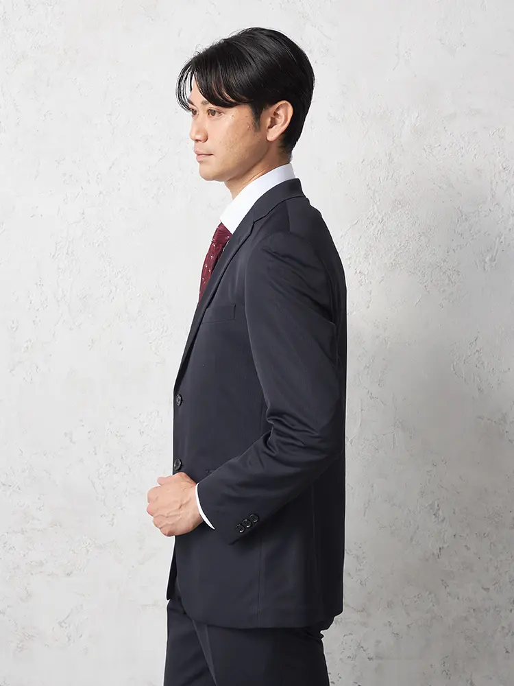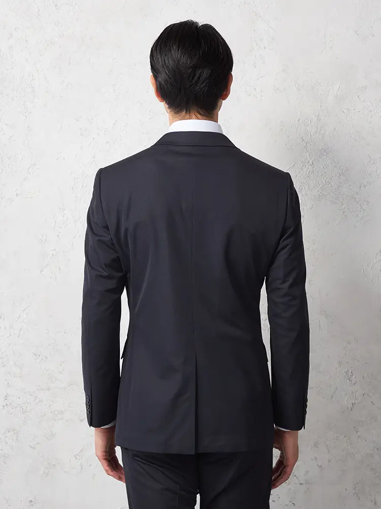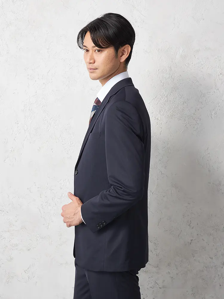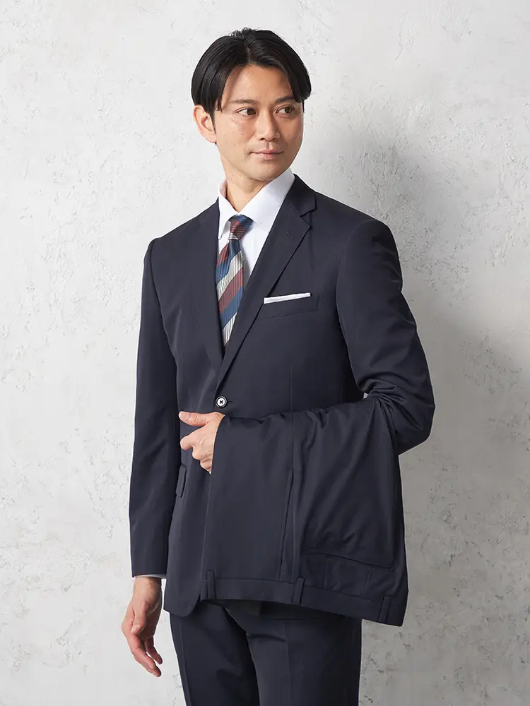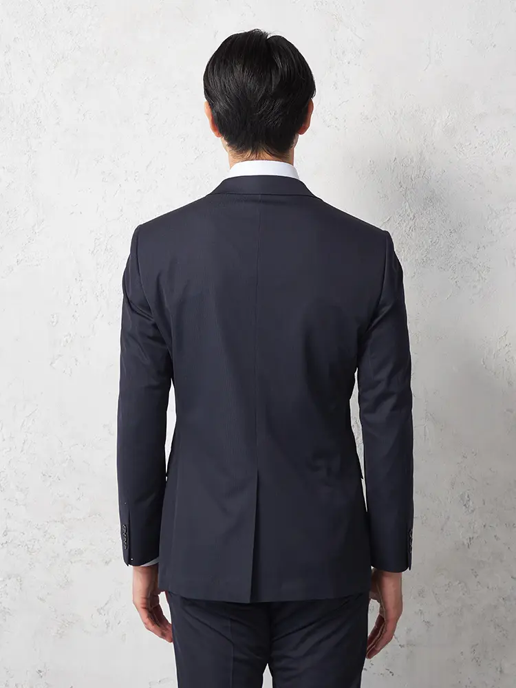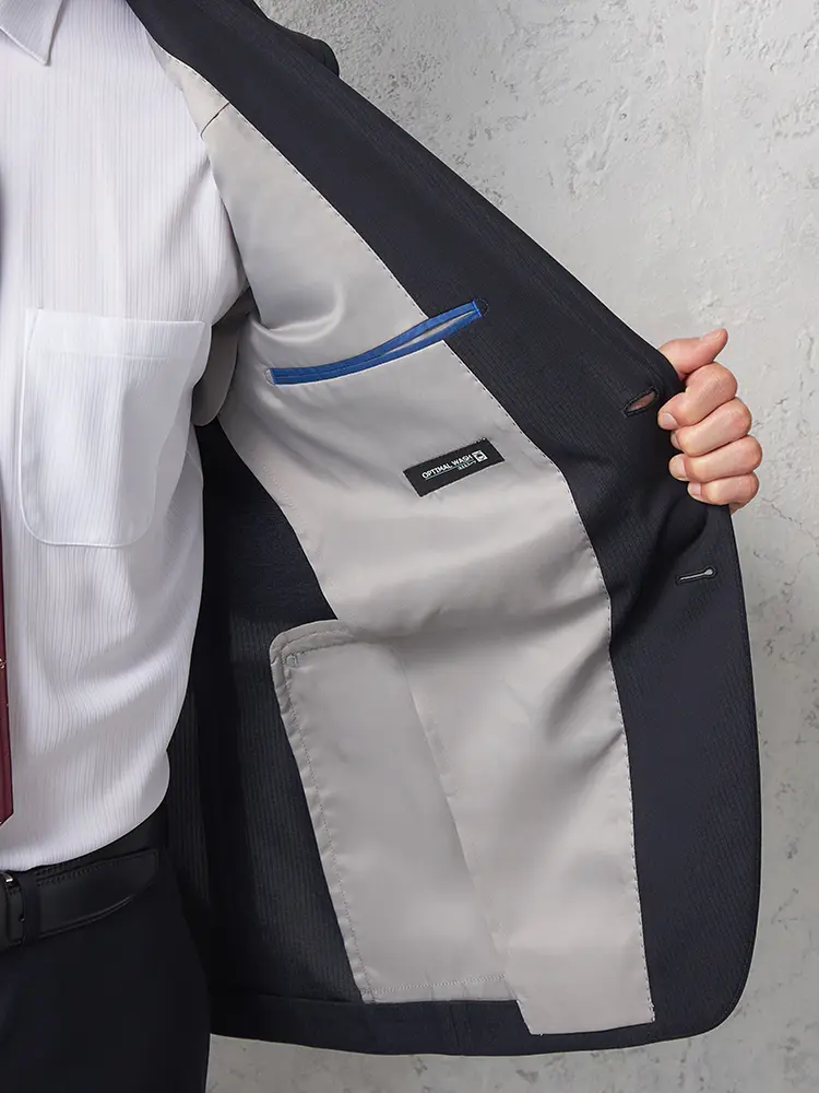 半裏仕様とセンターベントで動きやすく、上下ともに家庭で洗えるウォッシャブル仕様。