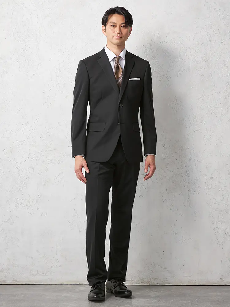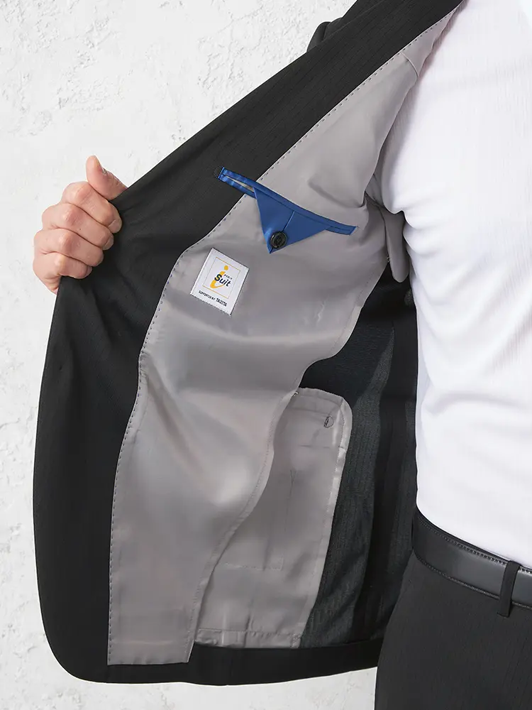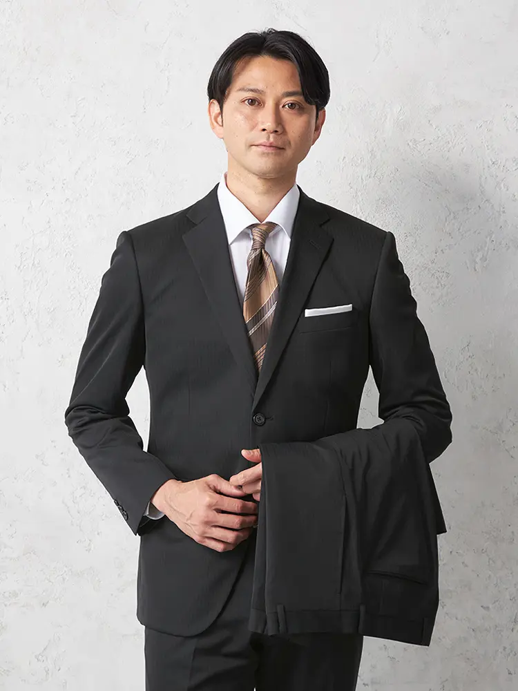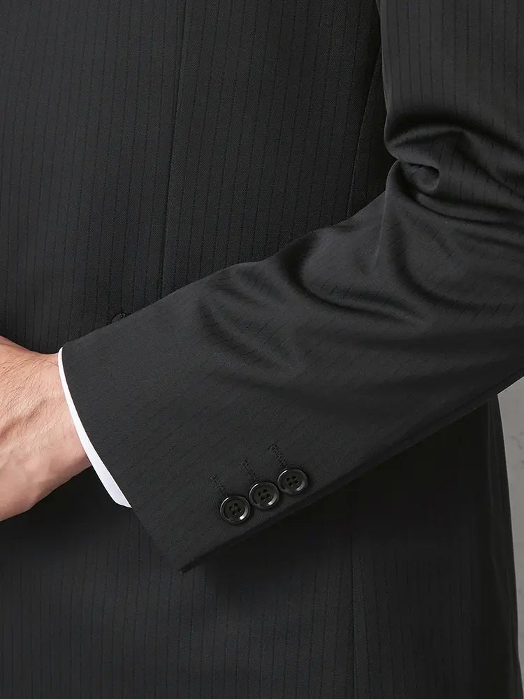 【即納】スーツ2つボタン【WEB限定】上下ウォッシャブルブラックストライプ3シーズン対応