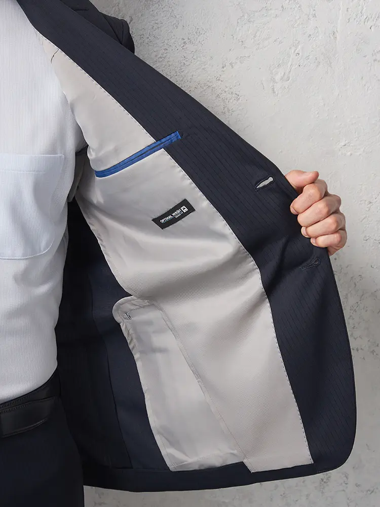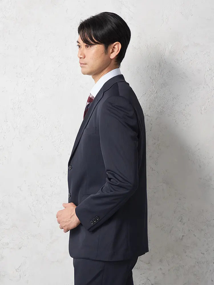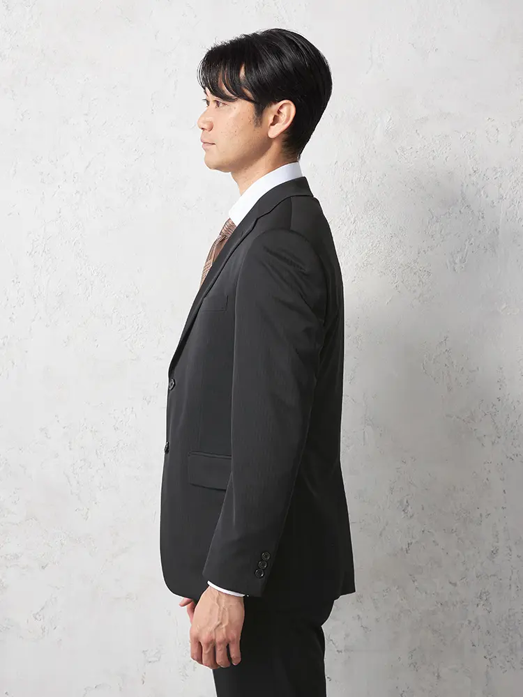 半裏仕様とセンターベントで動きやすく、上下ともに家庭で洗えるウォッシャブル仕様。