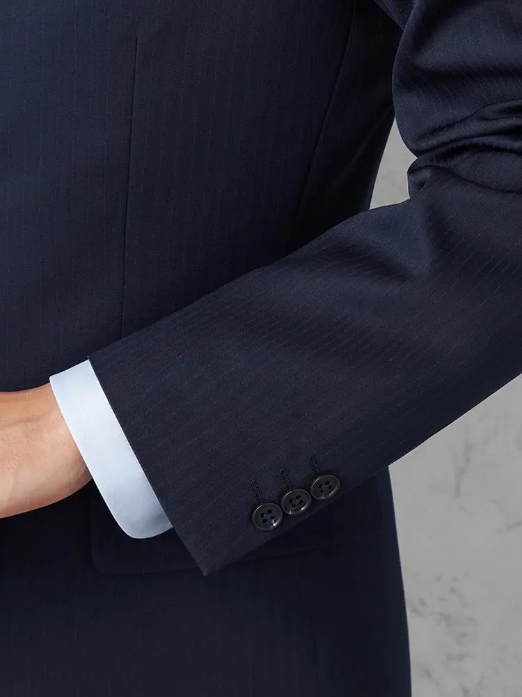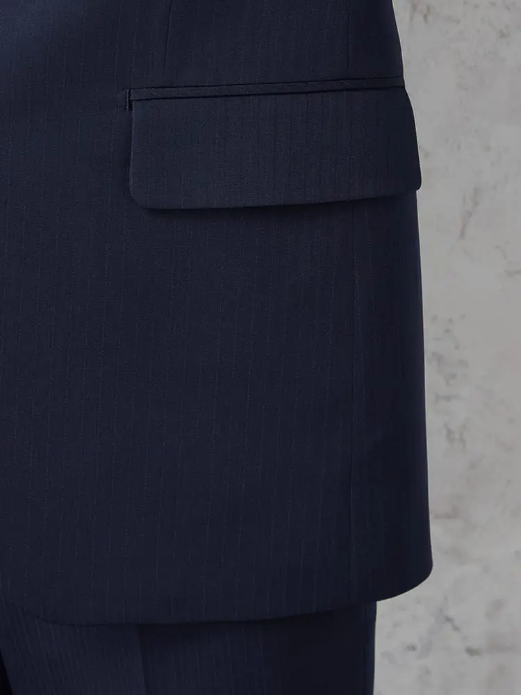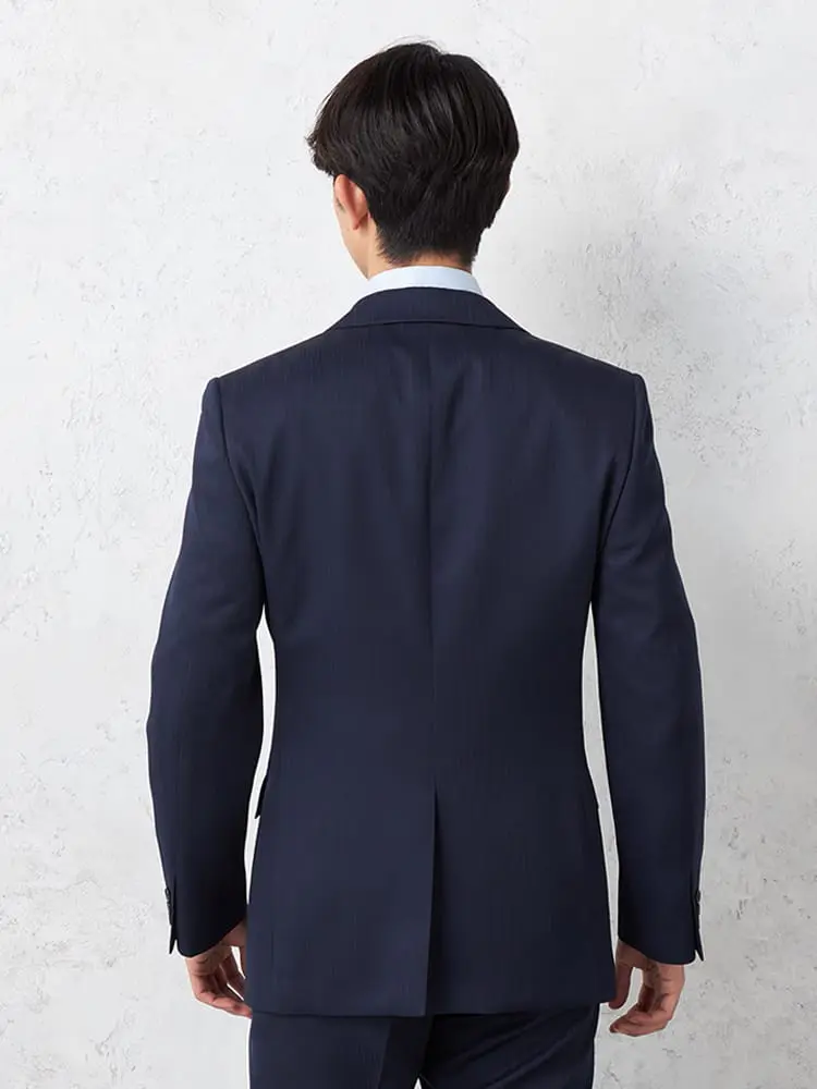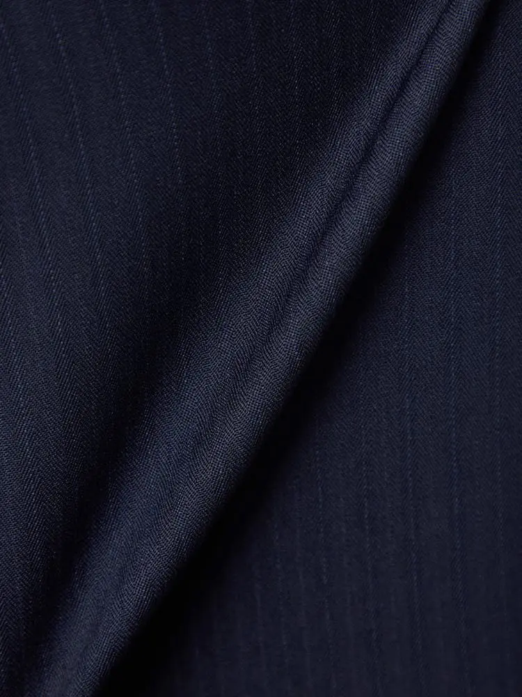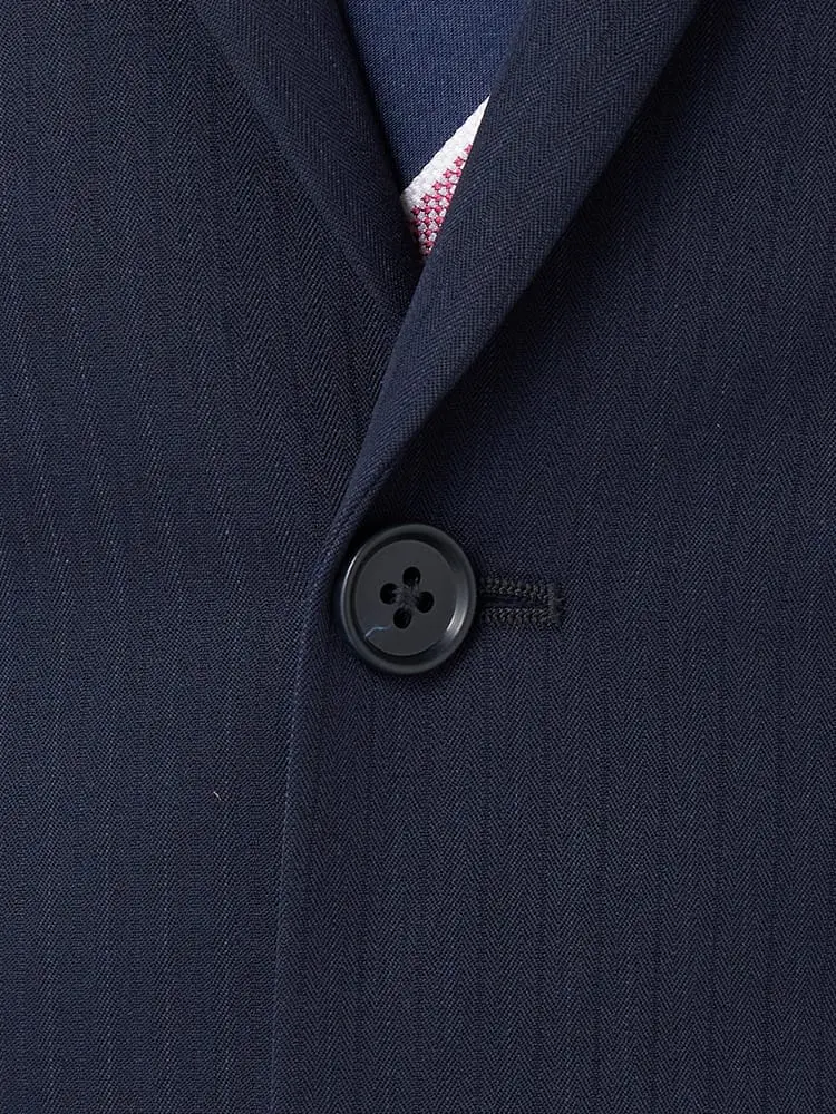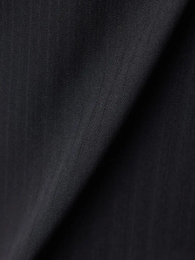 緻密なヘリンボーンストライプが深みとスリムな視覚効果を生む2つボタンスーツ。