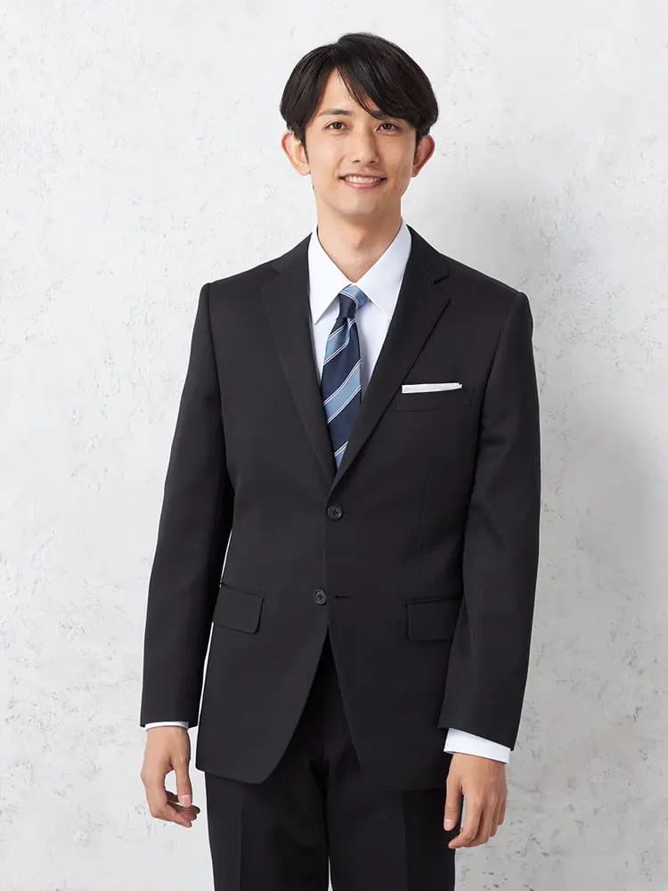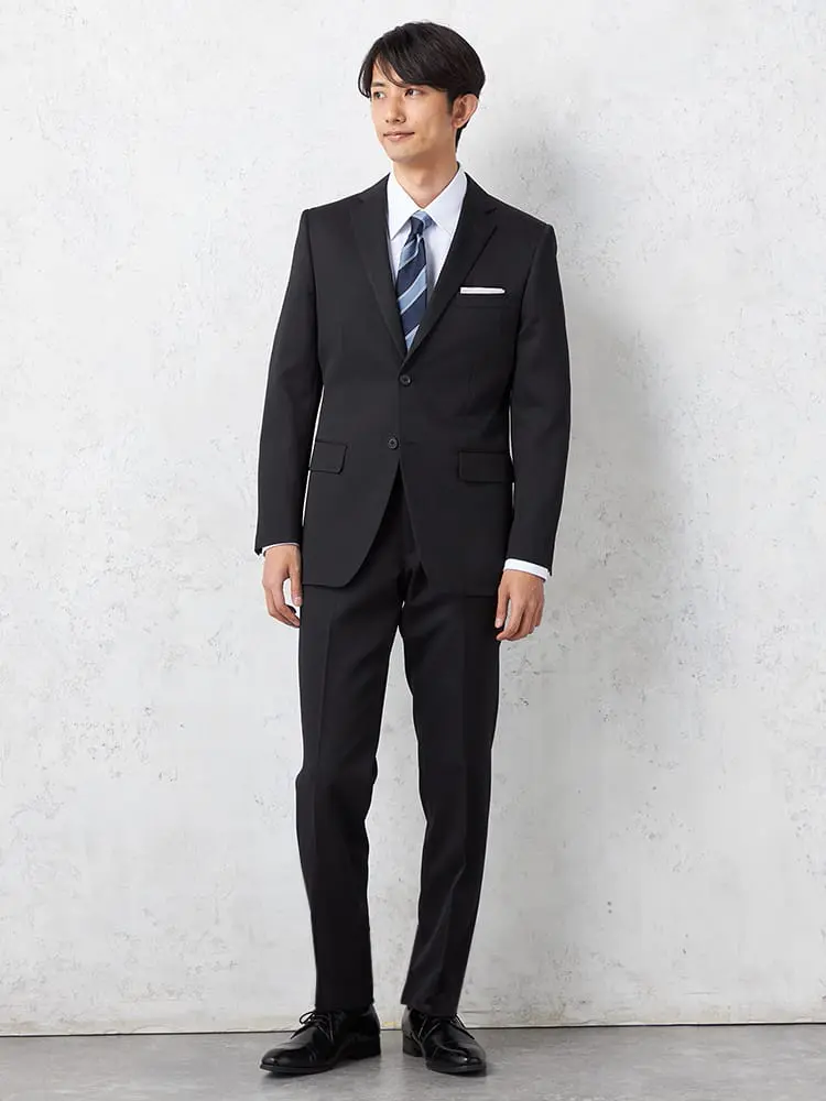 【即納】スーツ2つボタン【WEB限定】上下ウォッシャブルブラックストライプ3シーズン対応